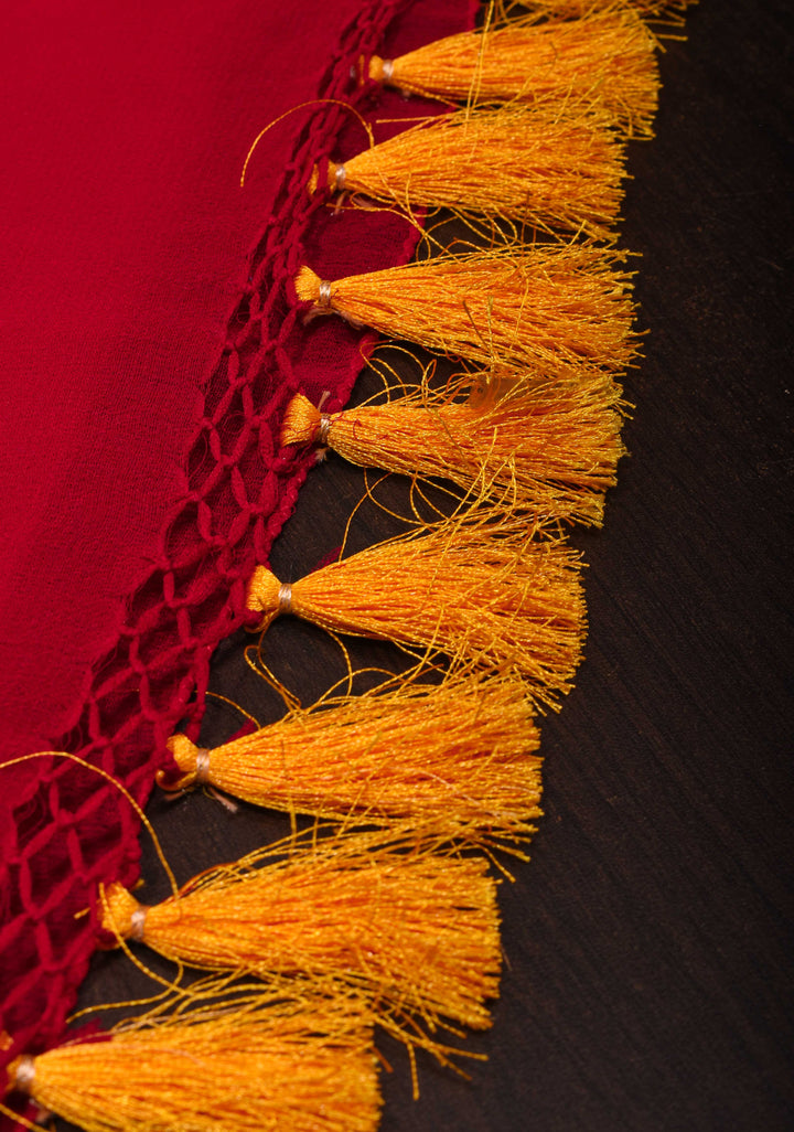 This saree is ready to wear with fall and pico done. Handmade silk tassels adorn the pallu and add more grace to it. An unstitched blouse fabric is included.