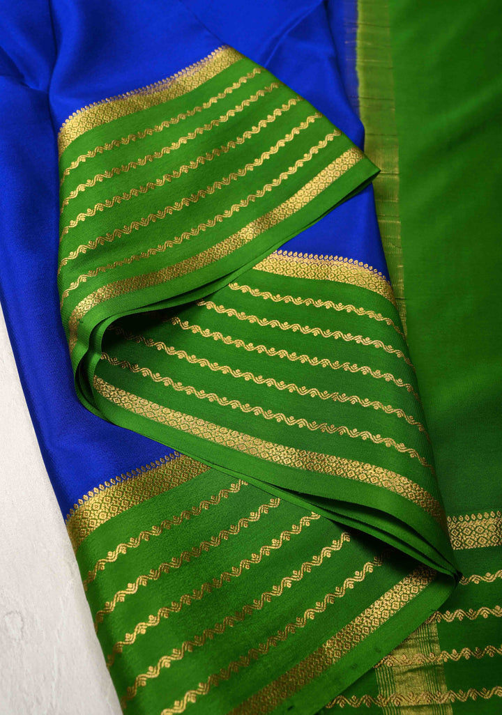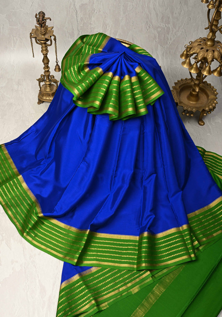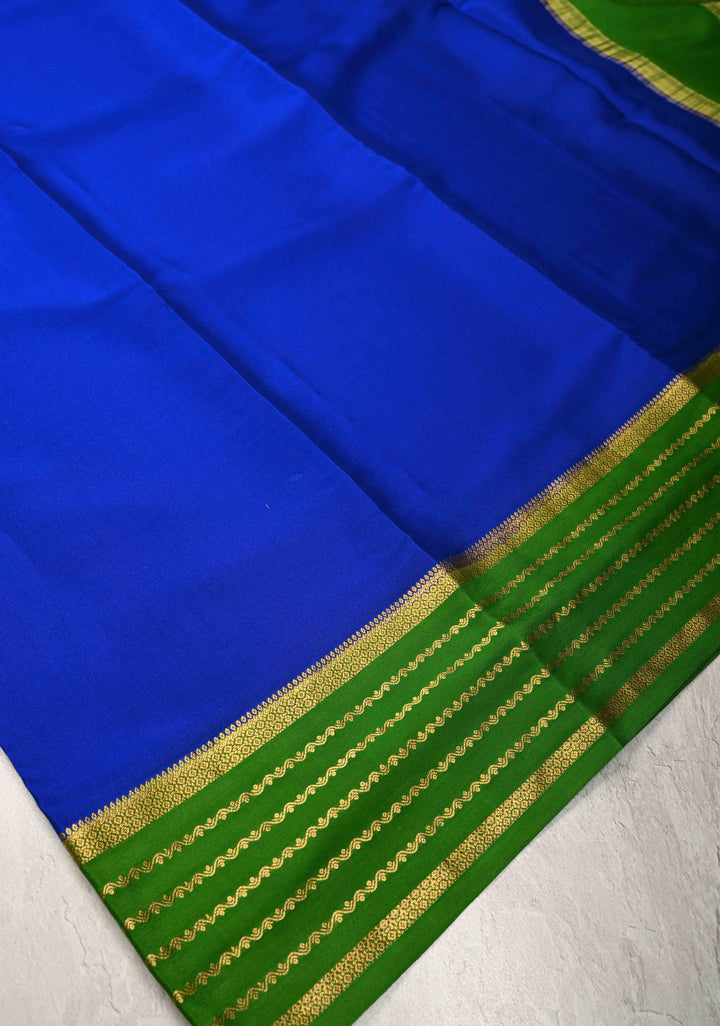 The deep royal blue hue exudes poise and grandeur, while the contrast zari borders add a striking frame, woven with intricate detailing that enhances the saree’s traditional appeal. Lightweight yet lustrous, this saree is ideal for weddings, religious functions, or formal gatherings where you want to stand out with understated elegance.