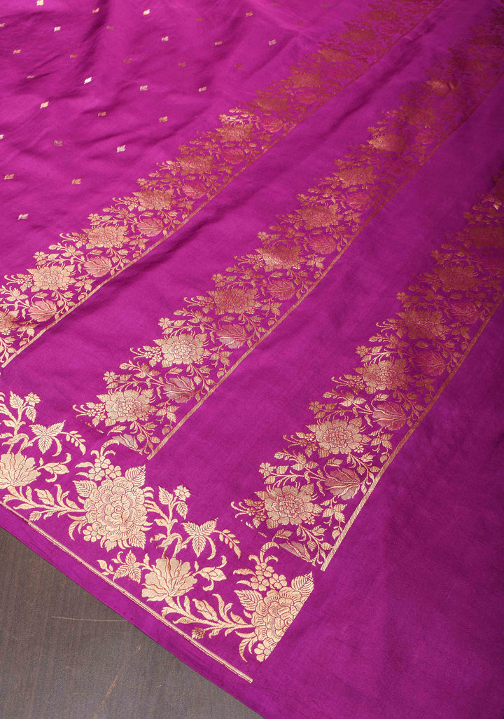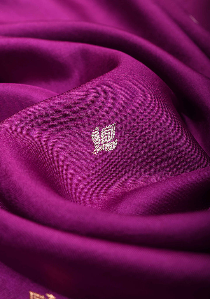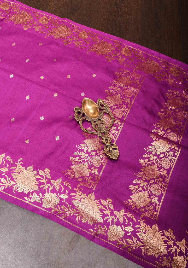This Royal Fuchsia Banarasi Mashru Silk Saree exudes regal elegance and timeless beauty. Crafted from luxurious Mashru silk, the saree features a smooth, lustrous texture that gracefully drapes the body. The saree is adorned with Sona Rupa buttas, intricate gold and silver motifs that add a touch of grandeur and sophistication. The rich zari border, woven with golden threads, enhances the opulence of the design, offering a stunning contrast against the vibrant fuchsia color. Ideal for weddings, festivals, and other grand occasions, this saree is a perfect blend of tradition, luxury, and modern elegance, making it a must-have for any festive wardrobe.
