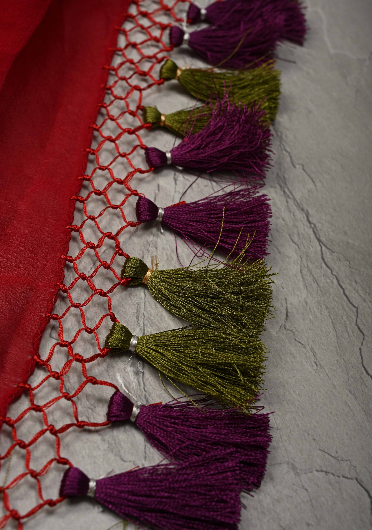 This saree is ready to wear with fall and pico done. tassels adorn the pallu and add more grace to it. An unstitched blouse fabric is included.
