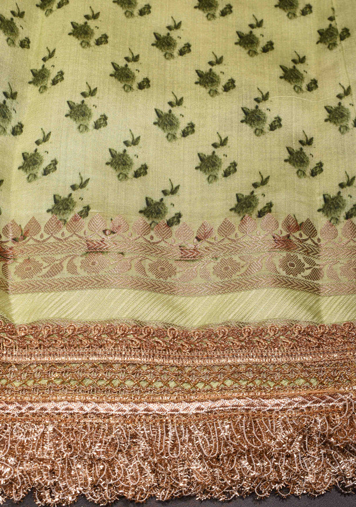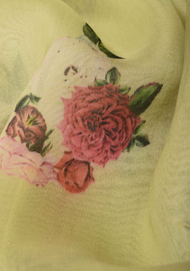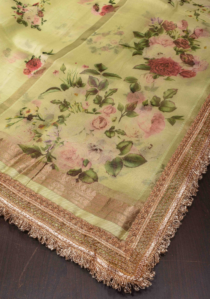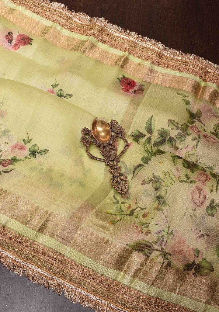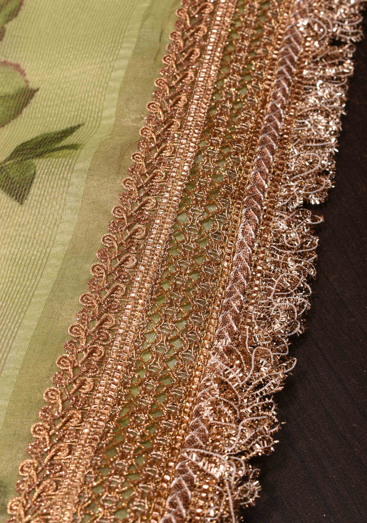 Grace your collection with this elegant Dew Green Pure Organza Silk Saree, featuring vibrant floral digital prints that exude charm and sophistication. The delicate lace trim border adds a refined and feminine touch, making it perfect for weddings, festive gatherings, or formal occasions. Crafted from lightweight organza silk, it drapes effortlessly, offering both style and comfort. With its beautiful blend of contemporary prints and traditional elegance, this saree is a timeless piece for any occasion.