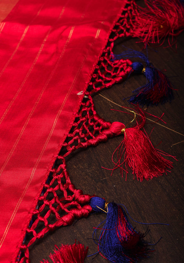 This saree is ready to wear with fall and pico done. tassels adorn the pallu and add more grace to it. An unstitched blouse fabric is included.
