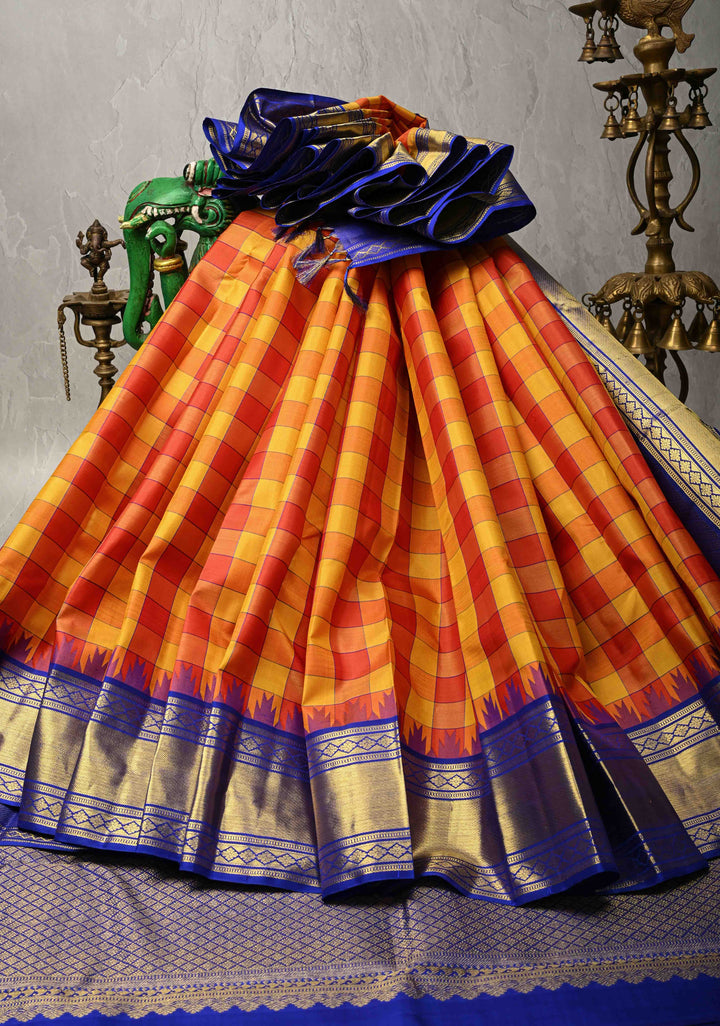Celebrate tradition and vibrant hues with this stunning Yellow-Red Kanjivaram Pure Silk Saree. Featuring a classic checks pattern woven intricately across the silk fabric, this saree beautifully blends bold colors with timeless craftsmanship.