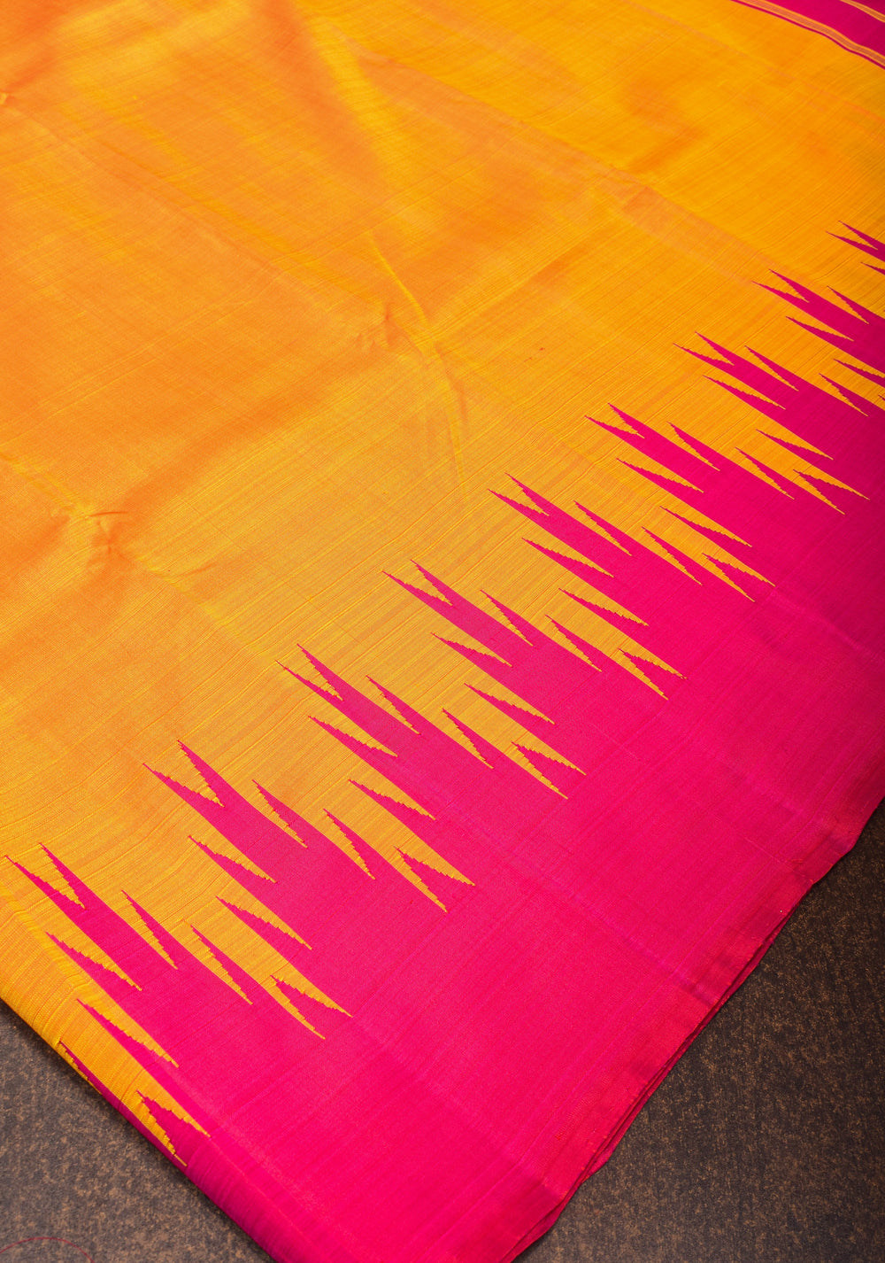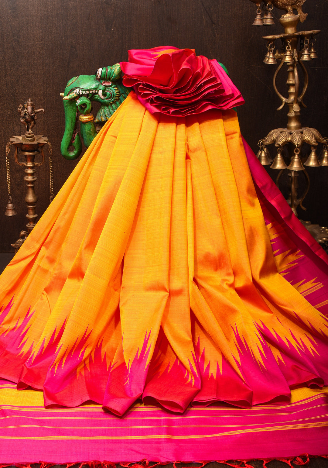 • Traditional motifs like temples, checks, florals, and peacocks are woven into the fabric, symbolizing cultural heritage.