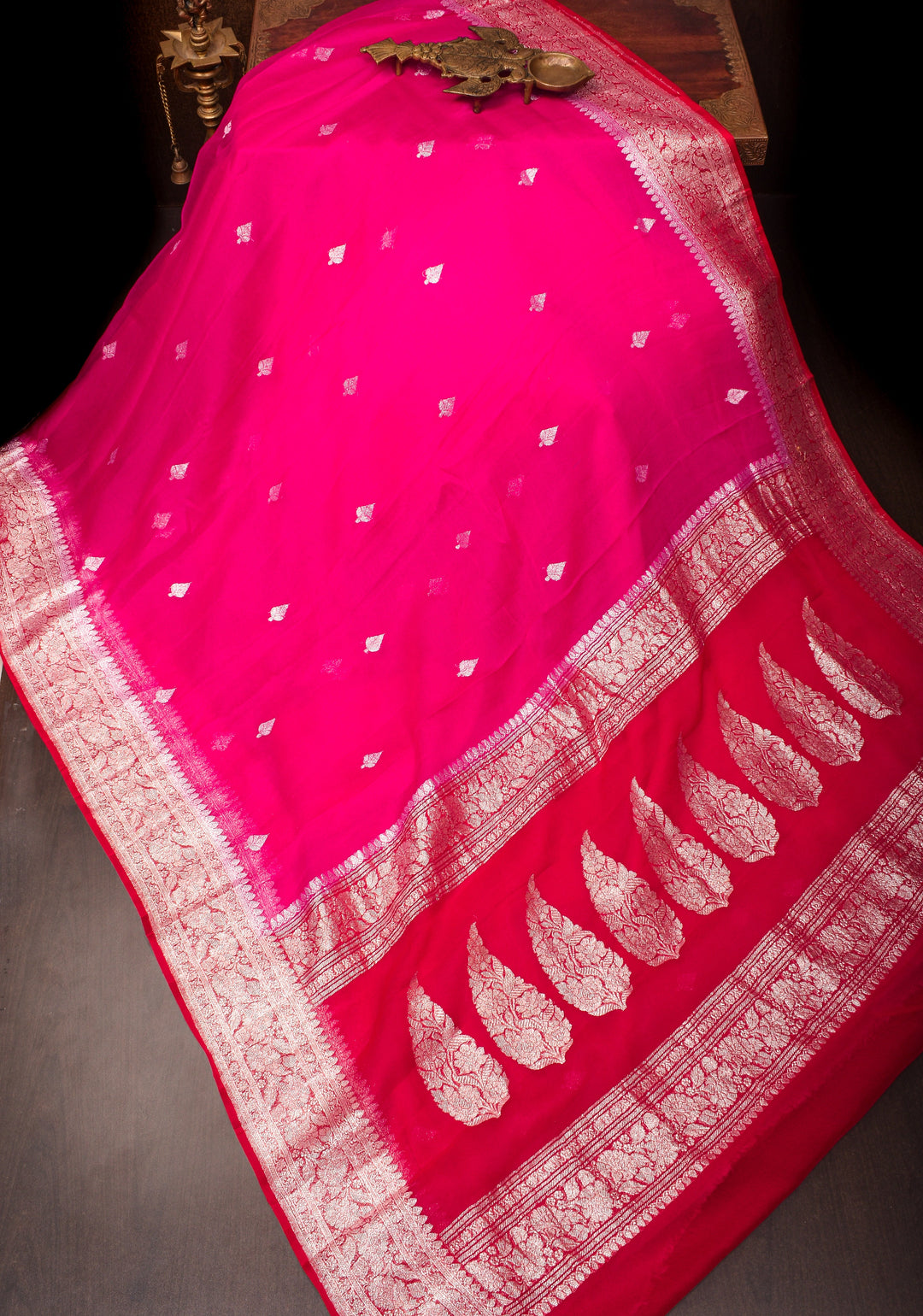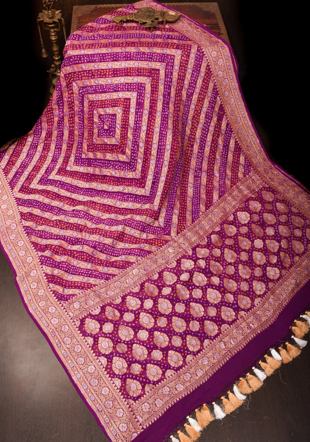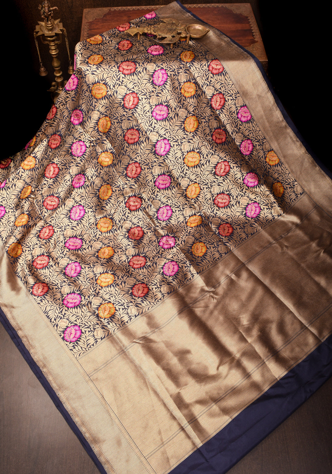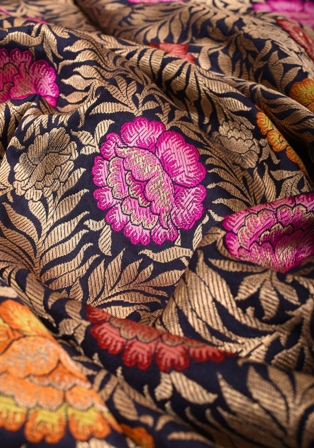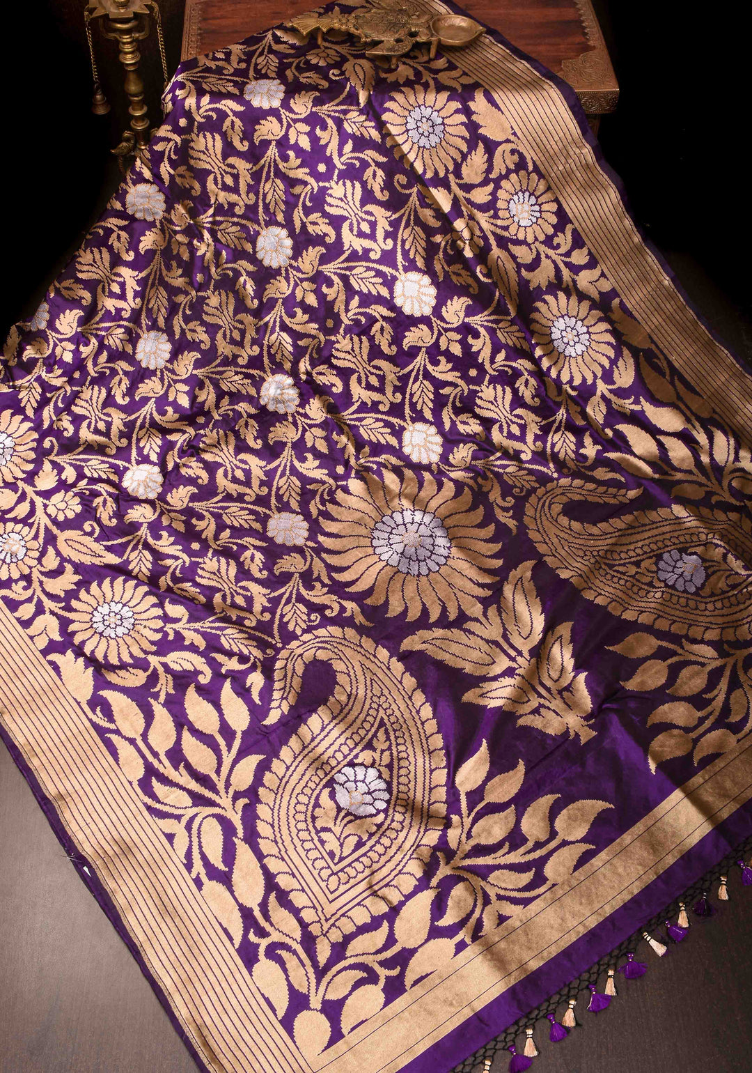 • Woven in Varanasi (Banaras), Uttar Pradesh, these sarees are known for their opulent look and intricate Mughal-inspired motifs.