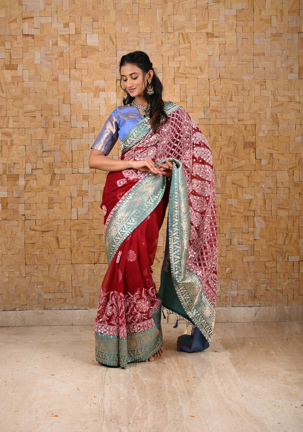 • Red, maroon, and gold silk sarees are favored in North Indian weddings, representing love, passion, and good fortune.