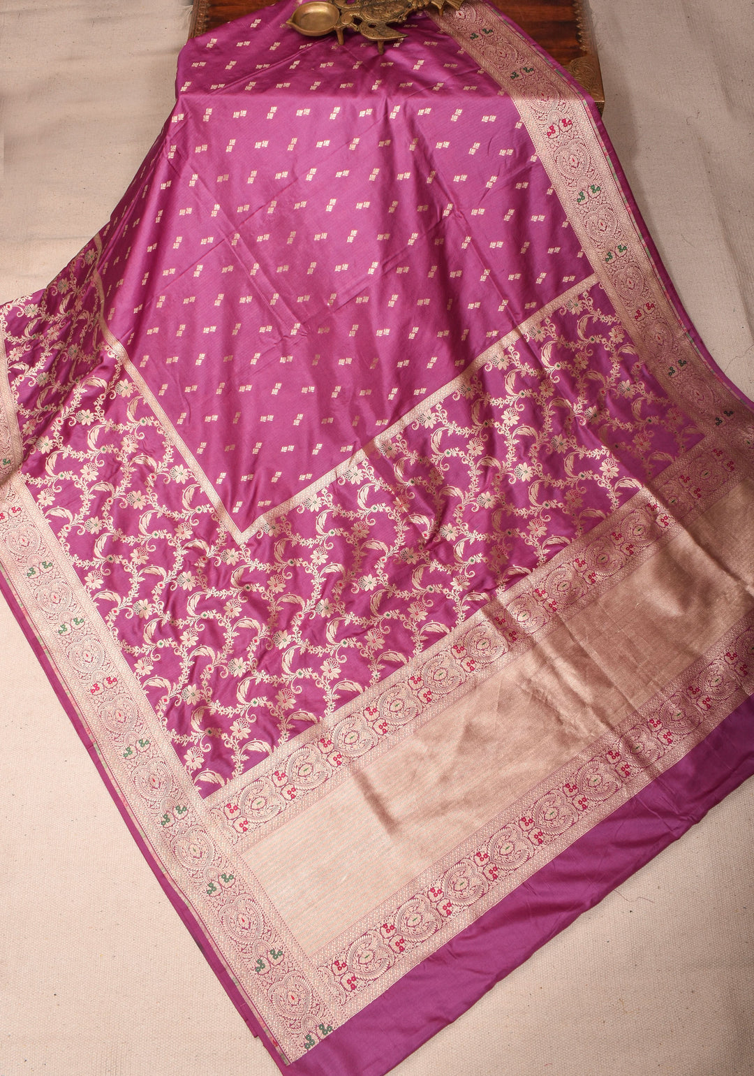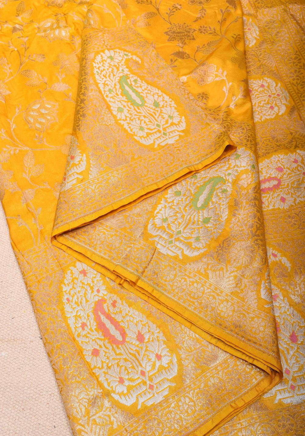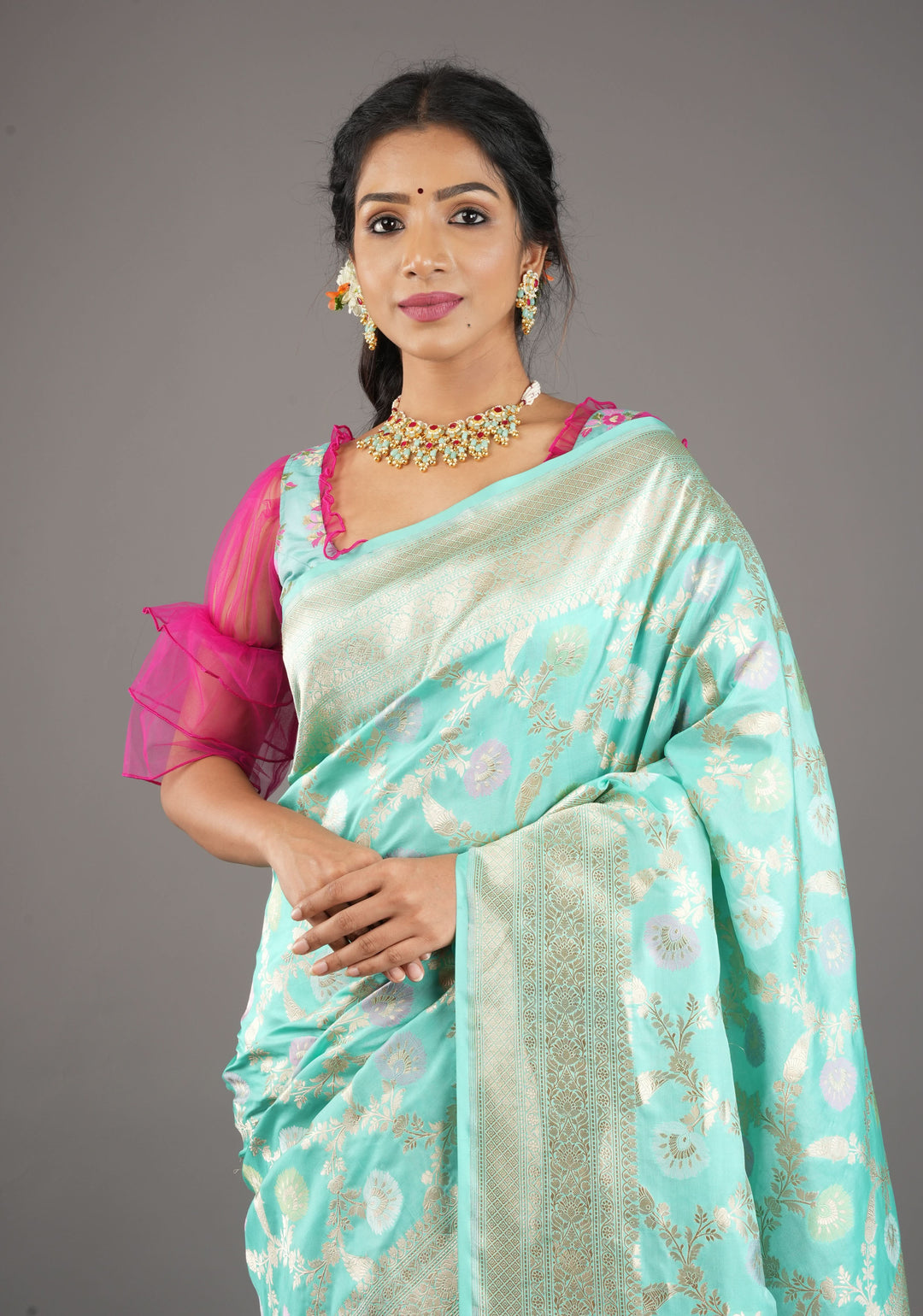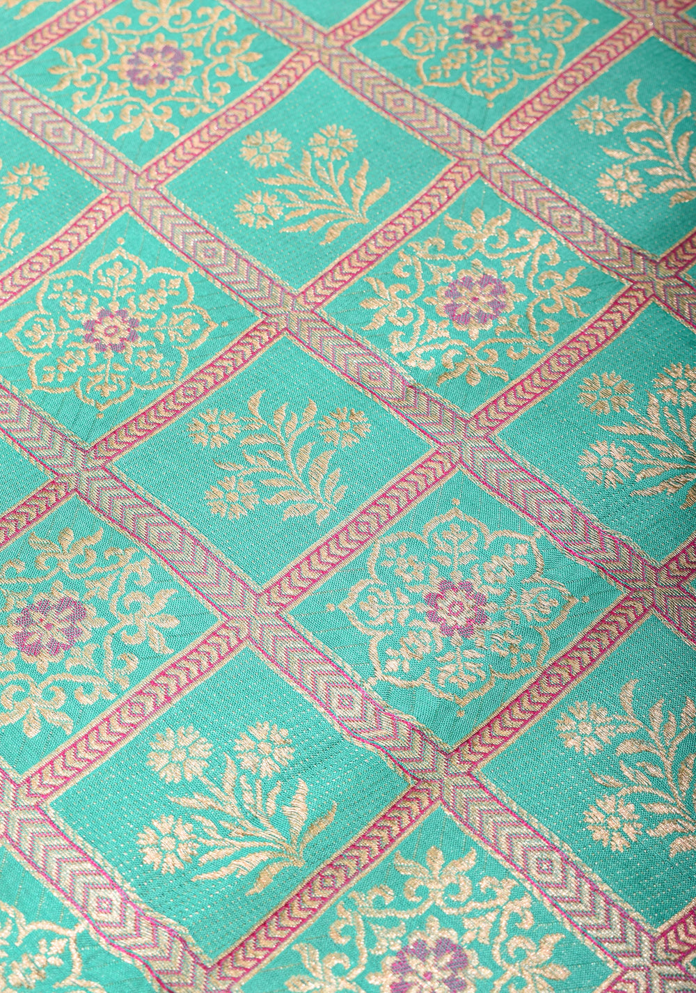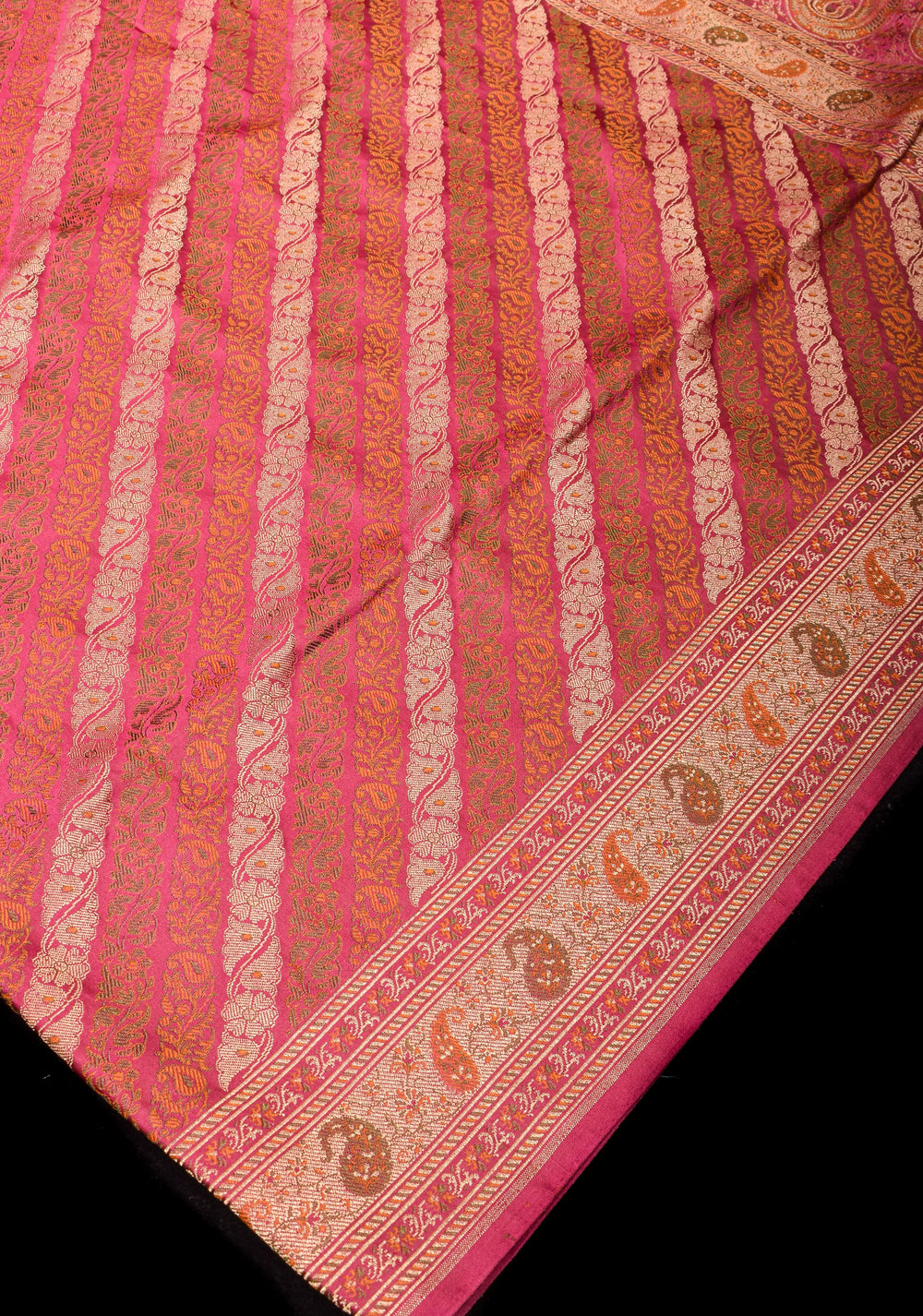 Woven in Varanasi (Banaras), Uttar Pradesh, these sarees are known for their opulent look and intricate Mughal-inspired motifs.