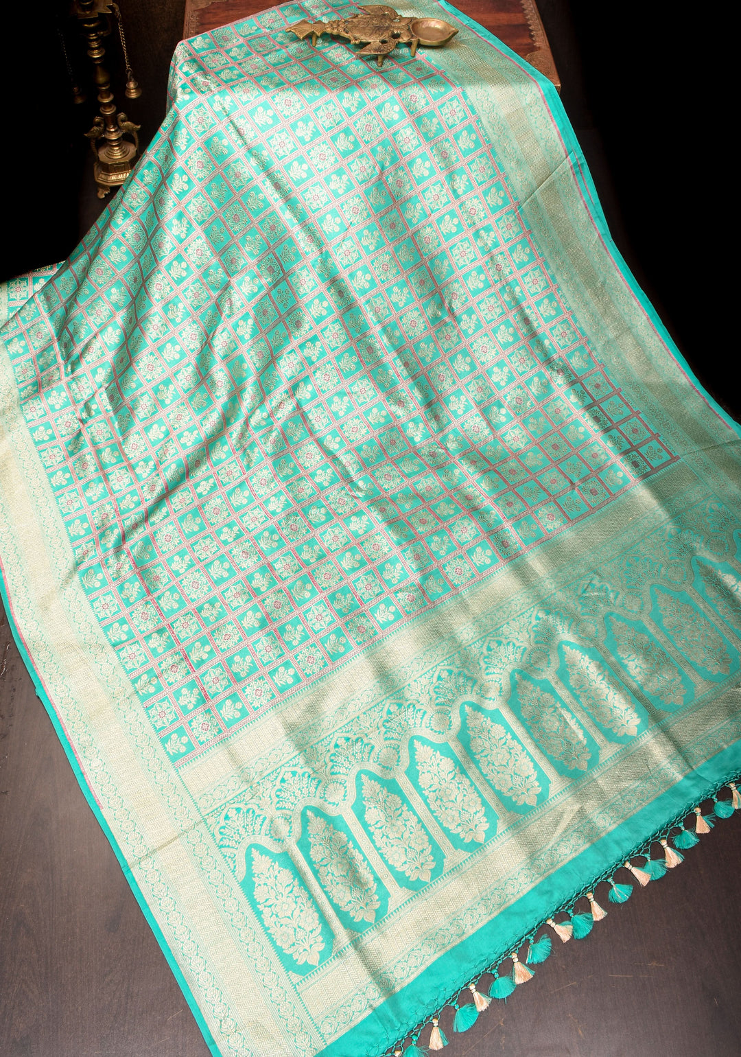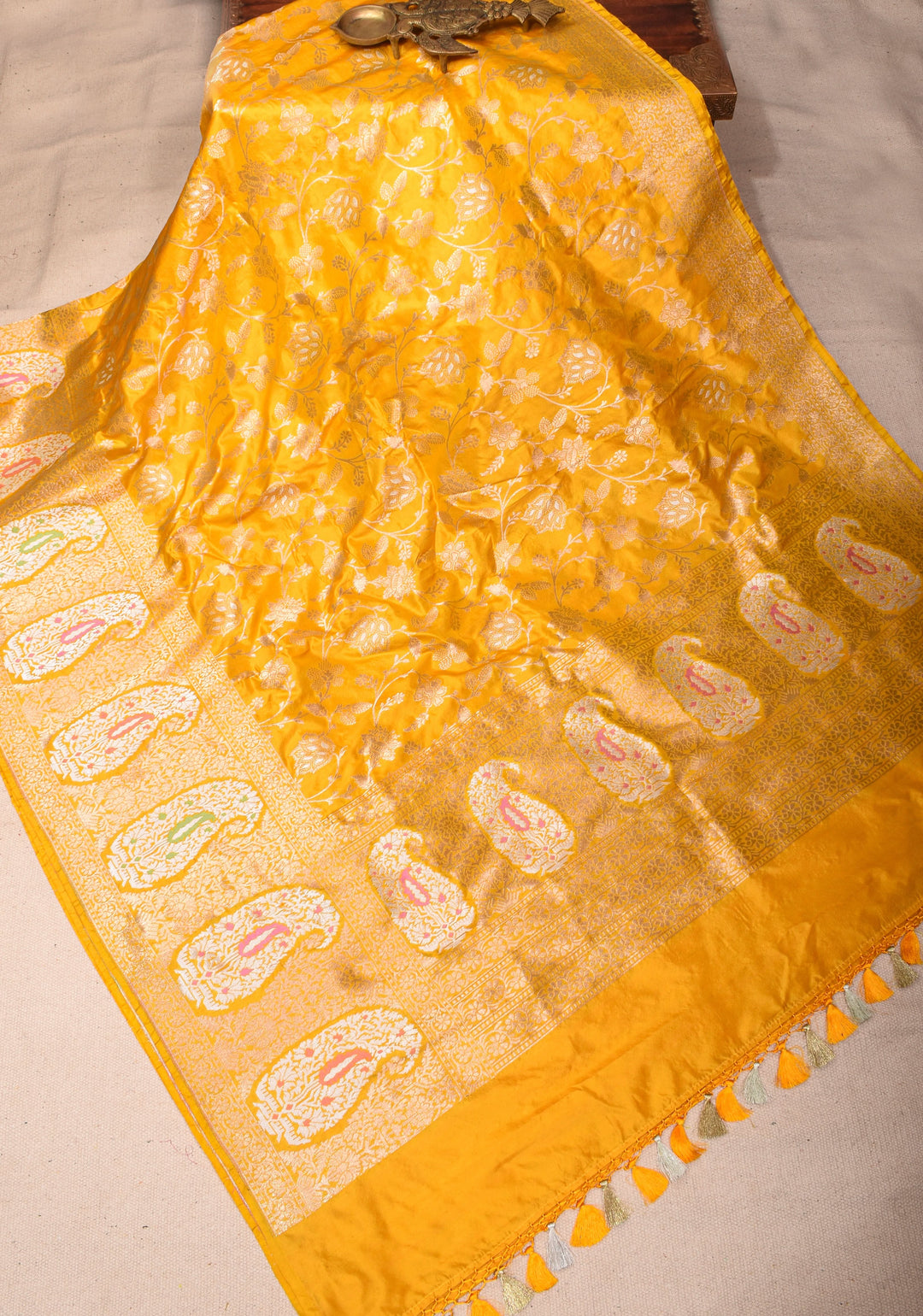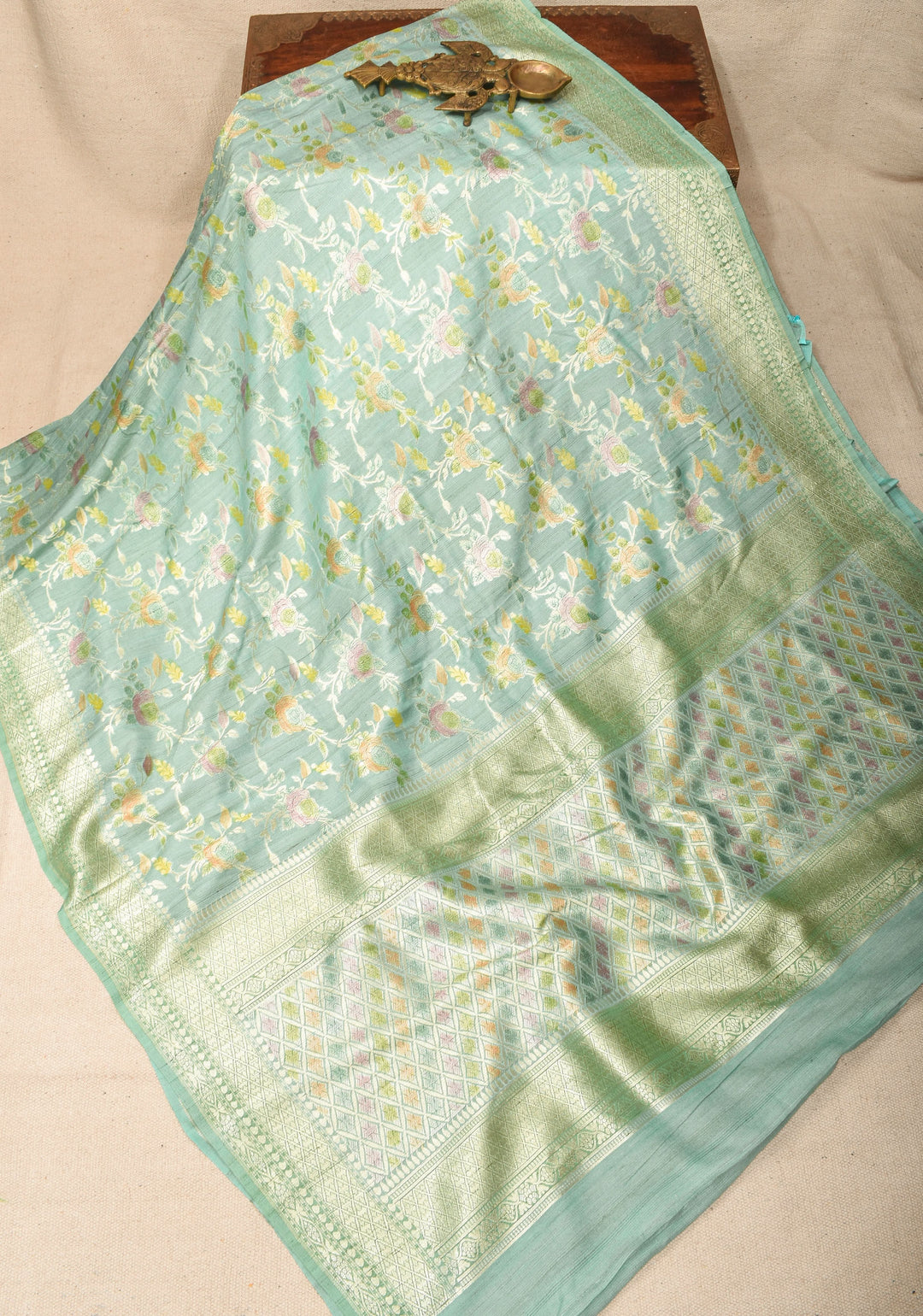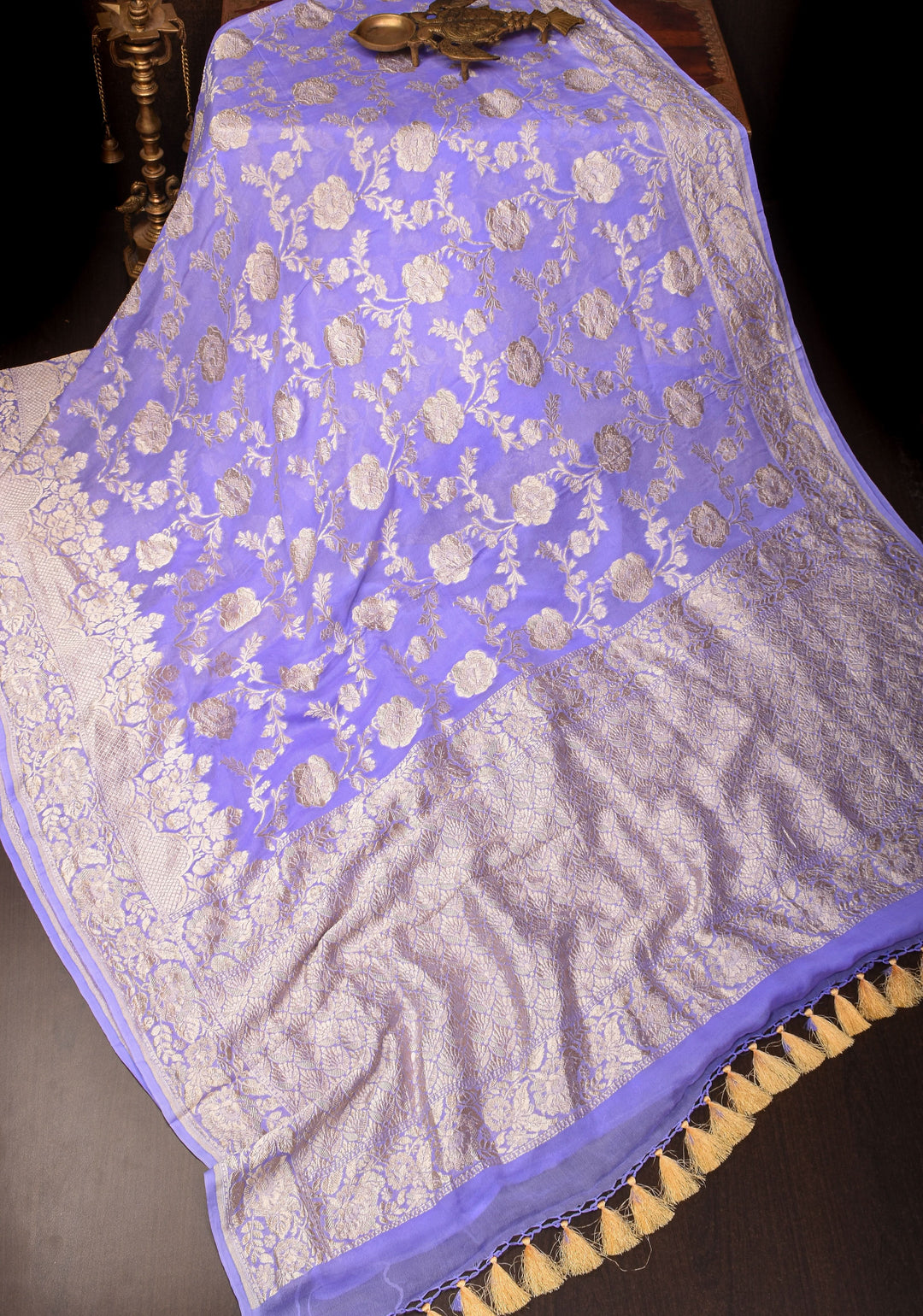 Woven in Varanasi (Banaras), Uttar Pradesh, these sarees are known for their opulent look and intricate Mughal-inspired motifs.