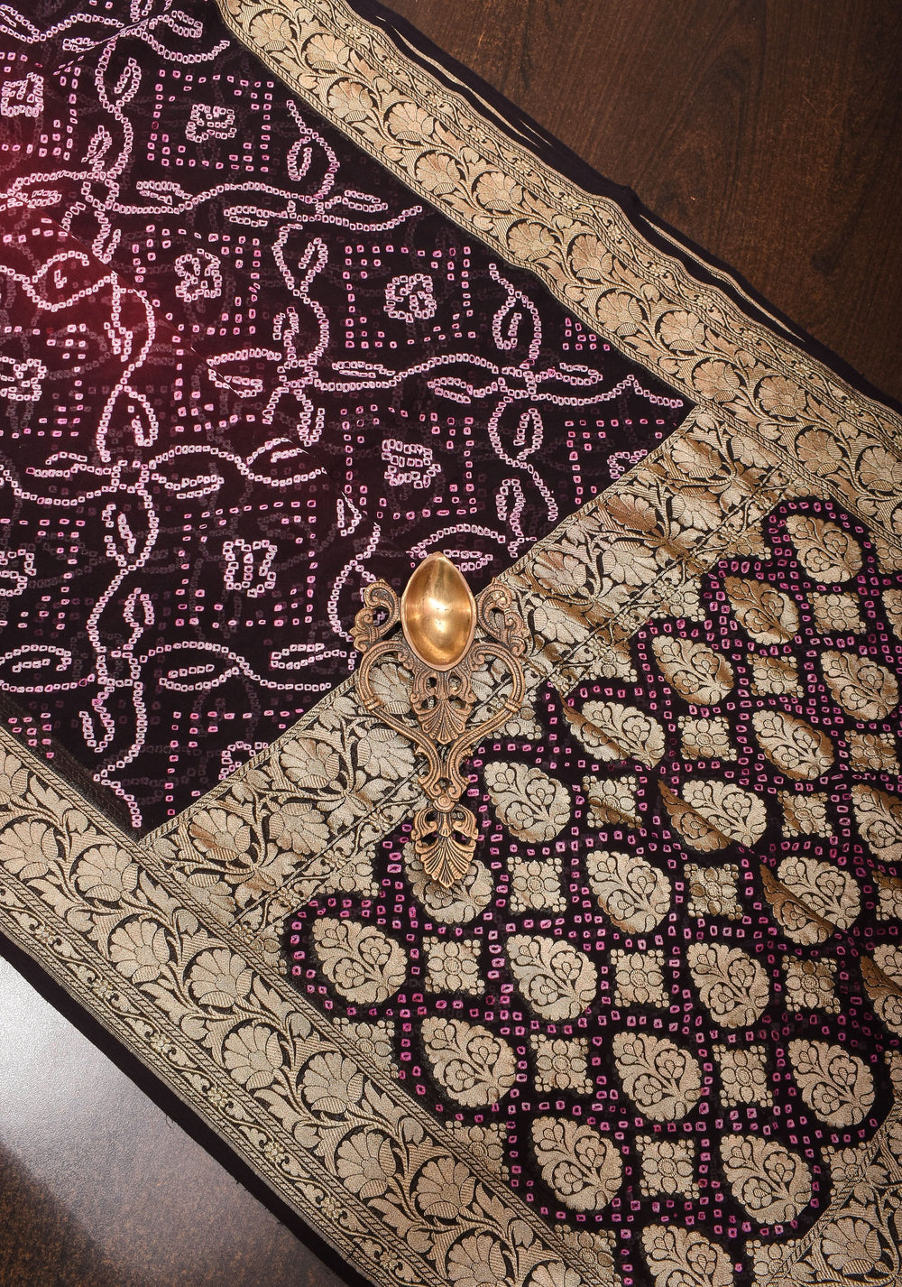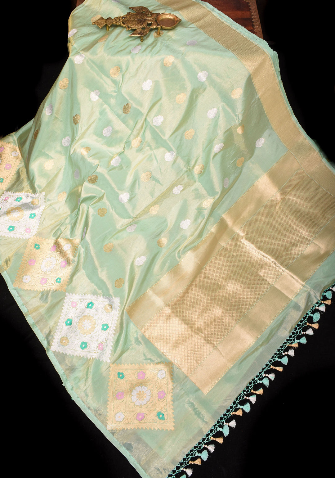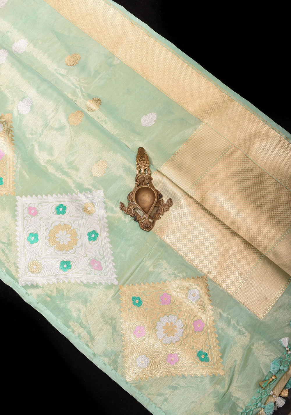 Avoid using a direct hot iron on zari or embroidered work, as excessive heat can dull the golden shine.