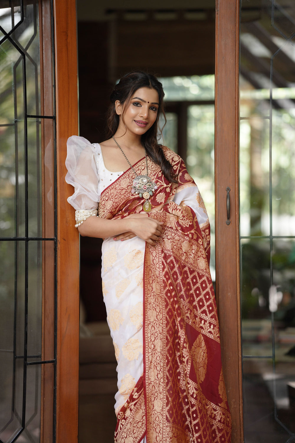 A white silk saree with a bold border or intricate motifs can enhance one’s presence, making them feel unique and radiant.