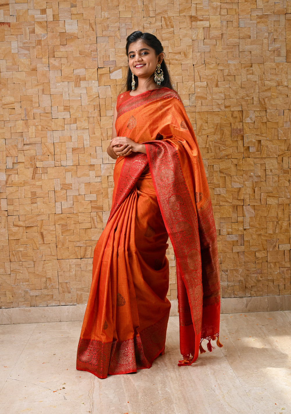 Check the weave and texture – Authentic silk sarees have a soft yet firm texture, a subtle sheen, and handwoven details that set them apart from synthetic alternatives.