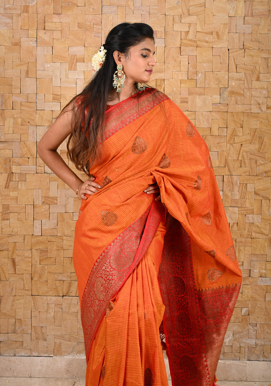 Tussar silk sarees – These have a natural golden hue and a slightly coarse texture, lending a rustic yet refined appeal.