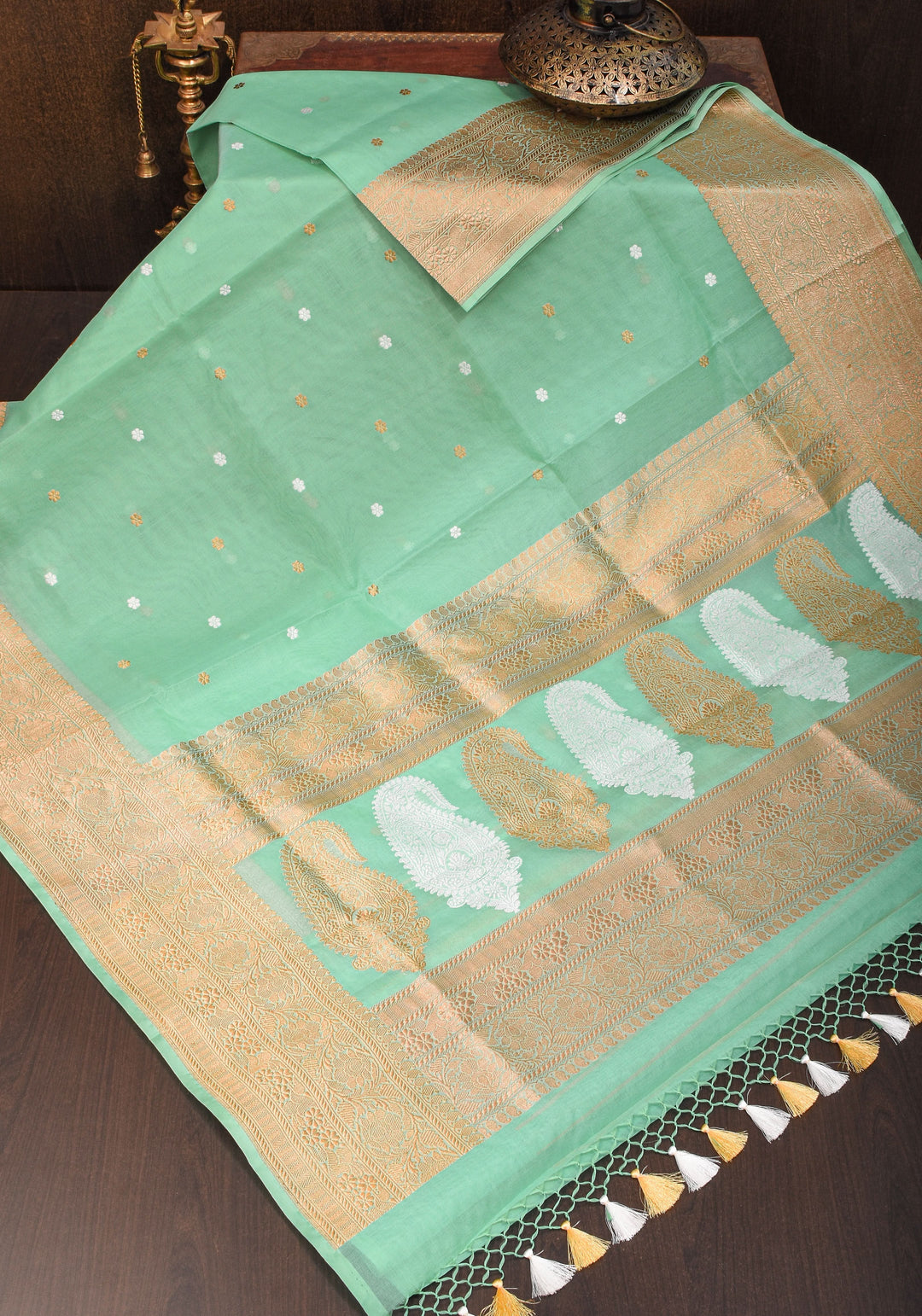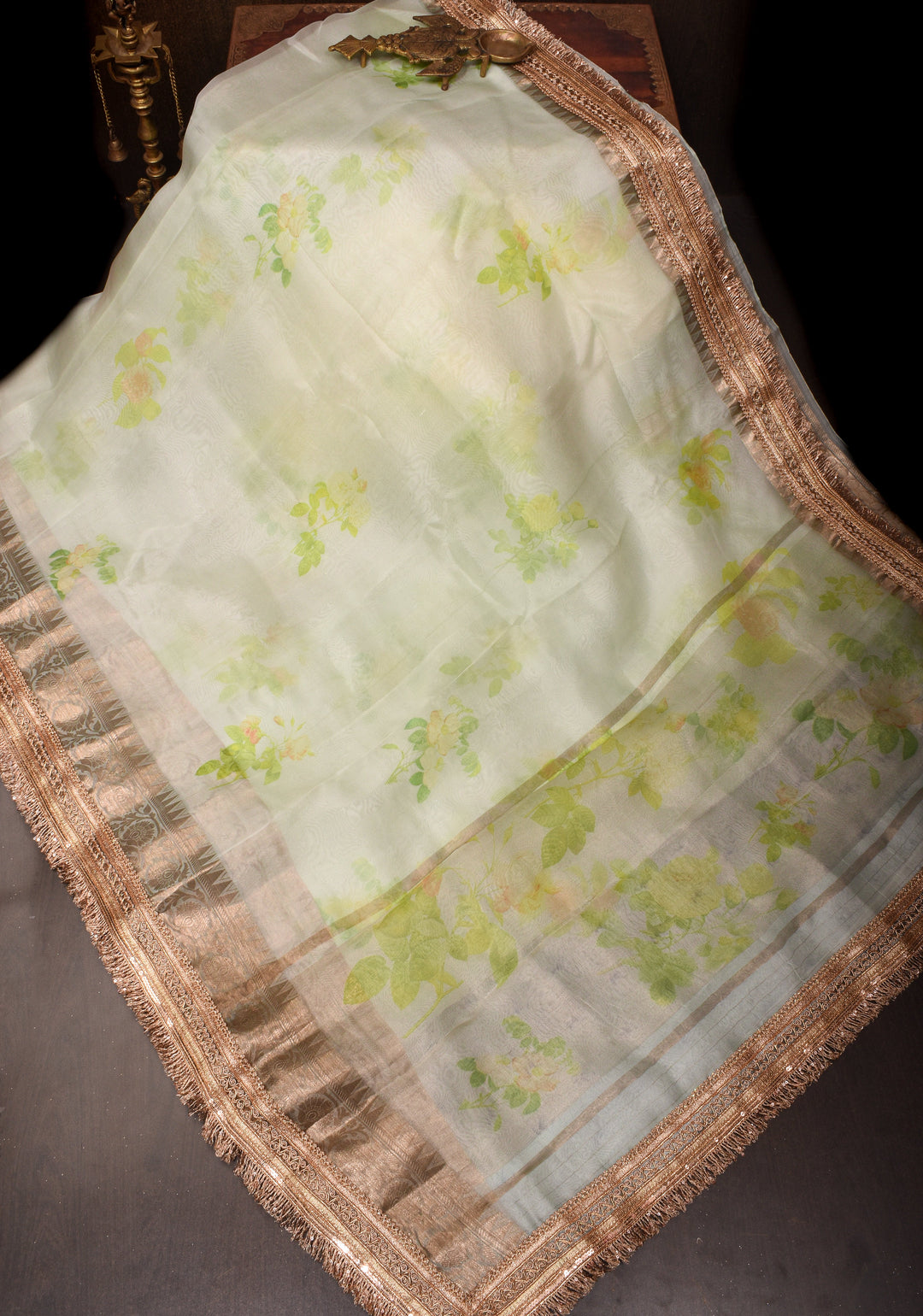 A white silk saree with intricate gold zari work is considered auspicious and is often chosen for bridal rituals.