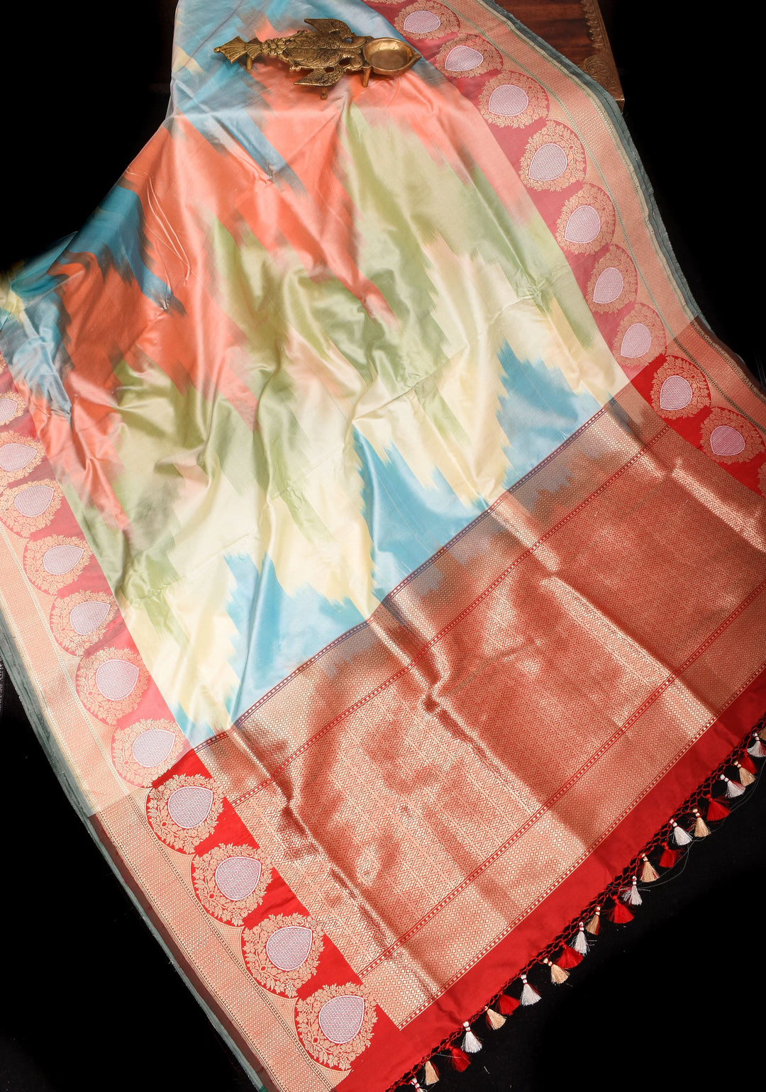 Bright silk sarees in shades of red, yellow, orange, and green symbolize festivity and joy.