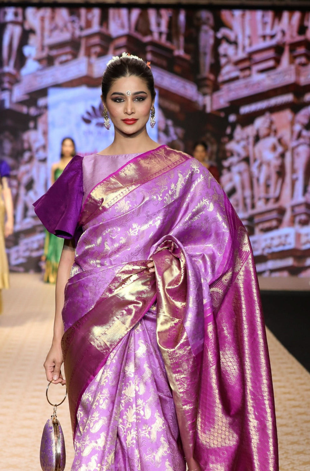 Kanjeevaram silk sarees – Known for their rich gold zari work, bold hues, and temple-inspired patterns, making them a bridal favorite.