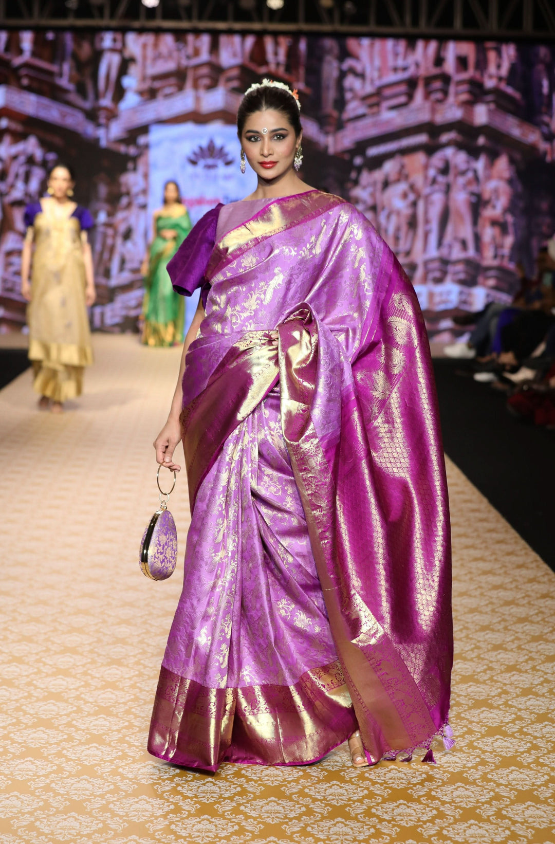 Traditional motifs like temples, checks, florals, and peacocks are woven into the fabric, symbolizing cultural heritage.
