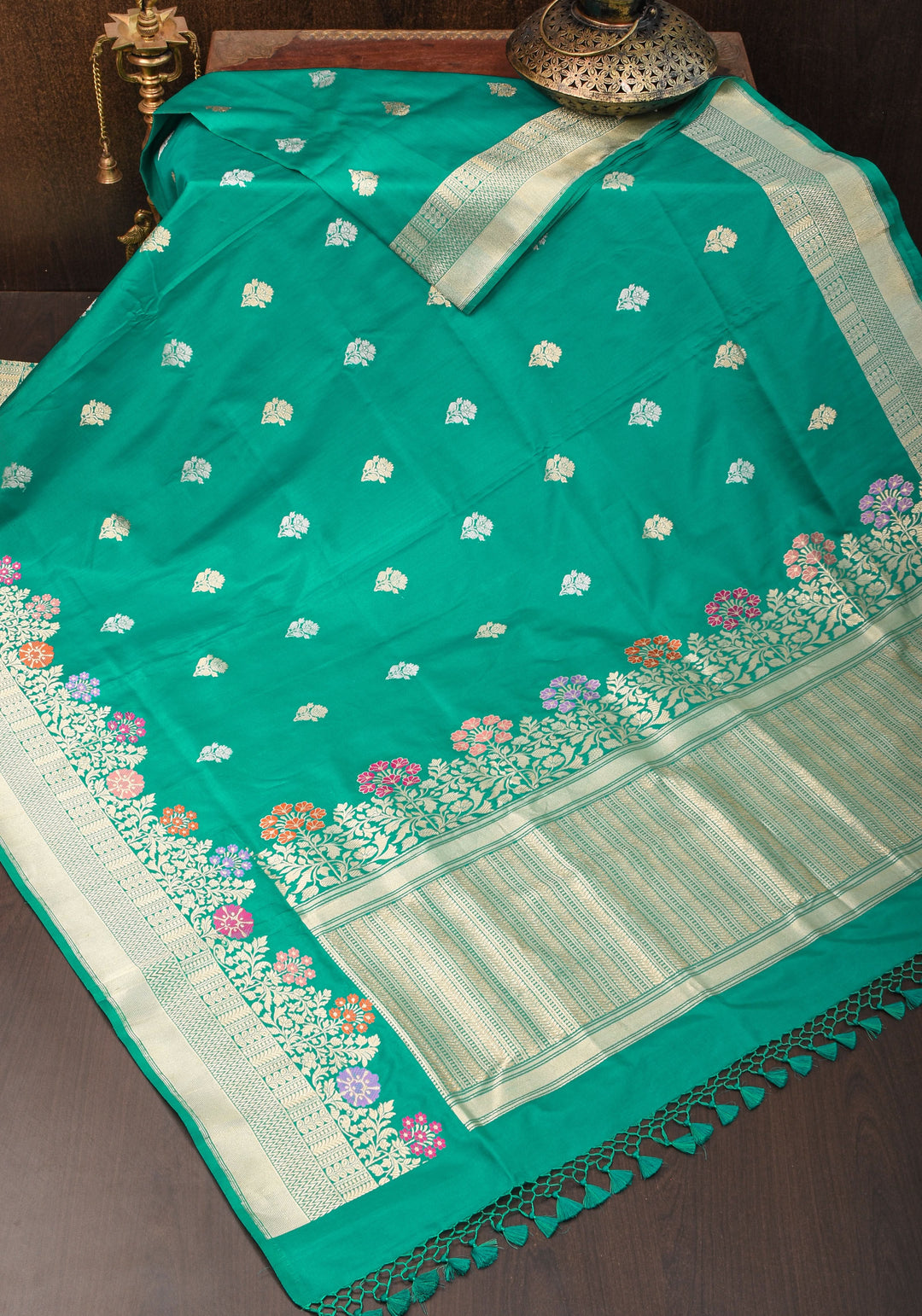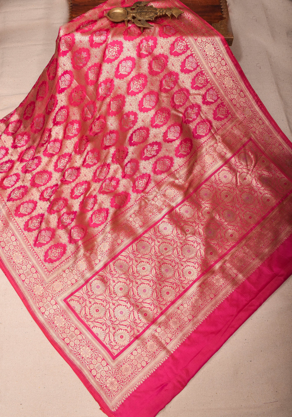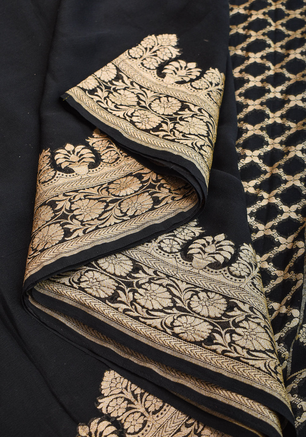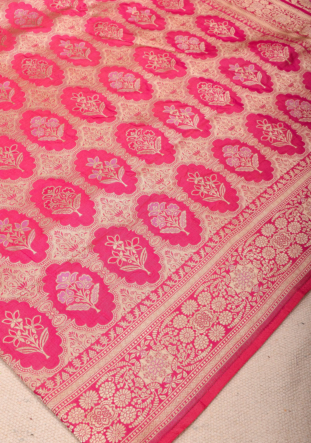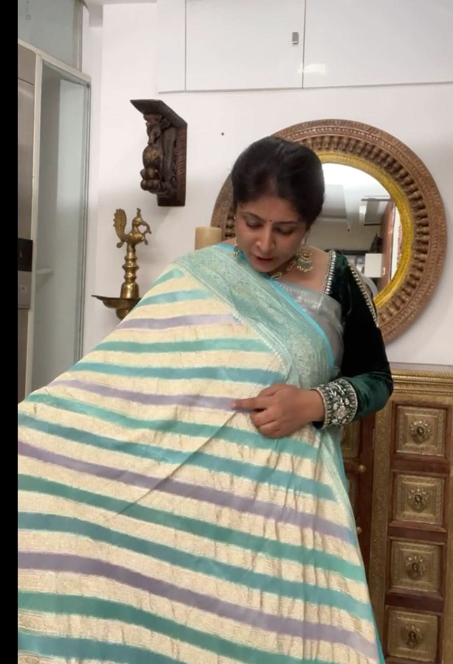 Woven in Varanasi (Banaras), Uttar Pradesh, these sarees are known for their opulent look and intricate Mughal-inspired motifs.