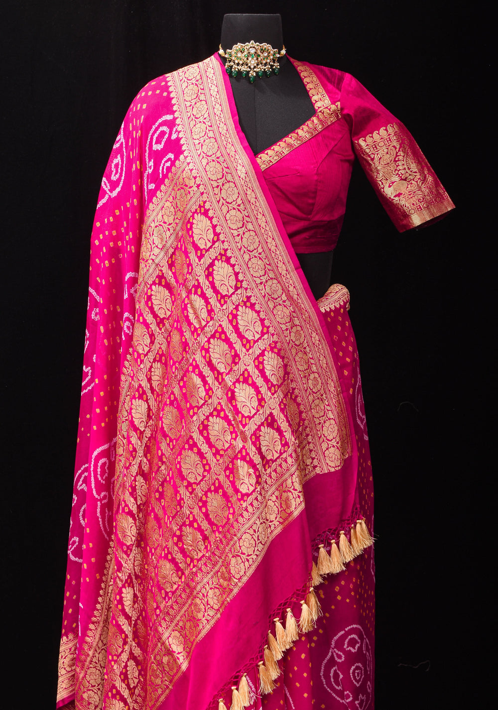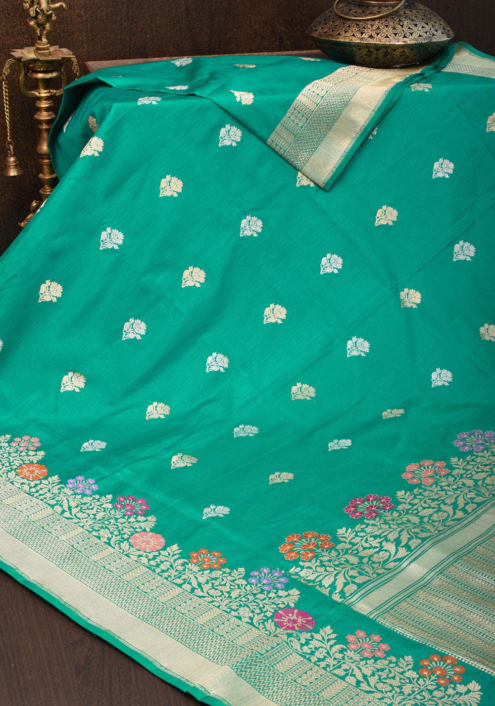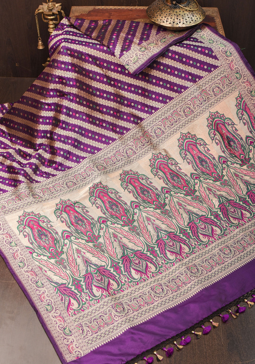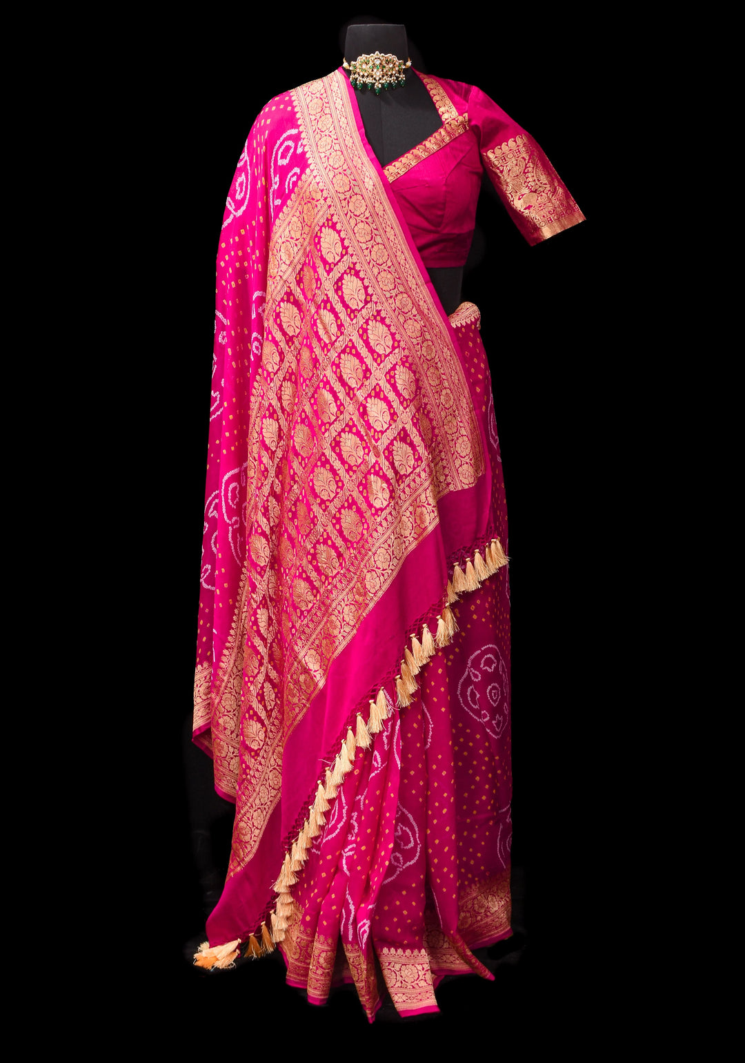 Woven in Varanasi (Banaras), Uttar Pradesh, these sarees are known for their opulent look and intricate Mughal-inspired motifs.