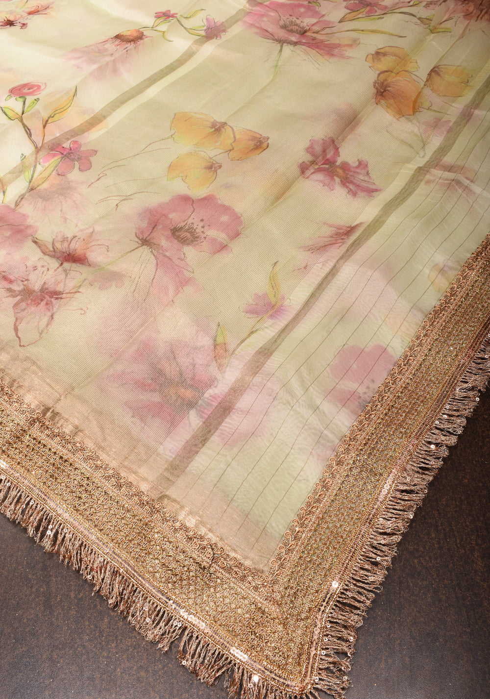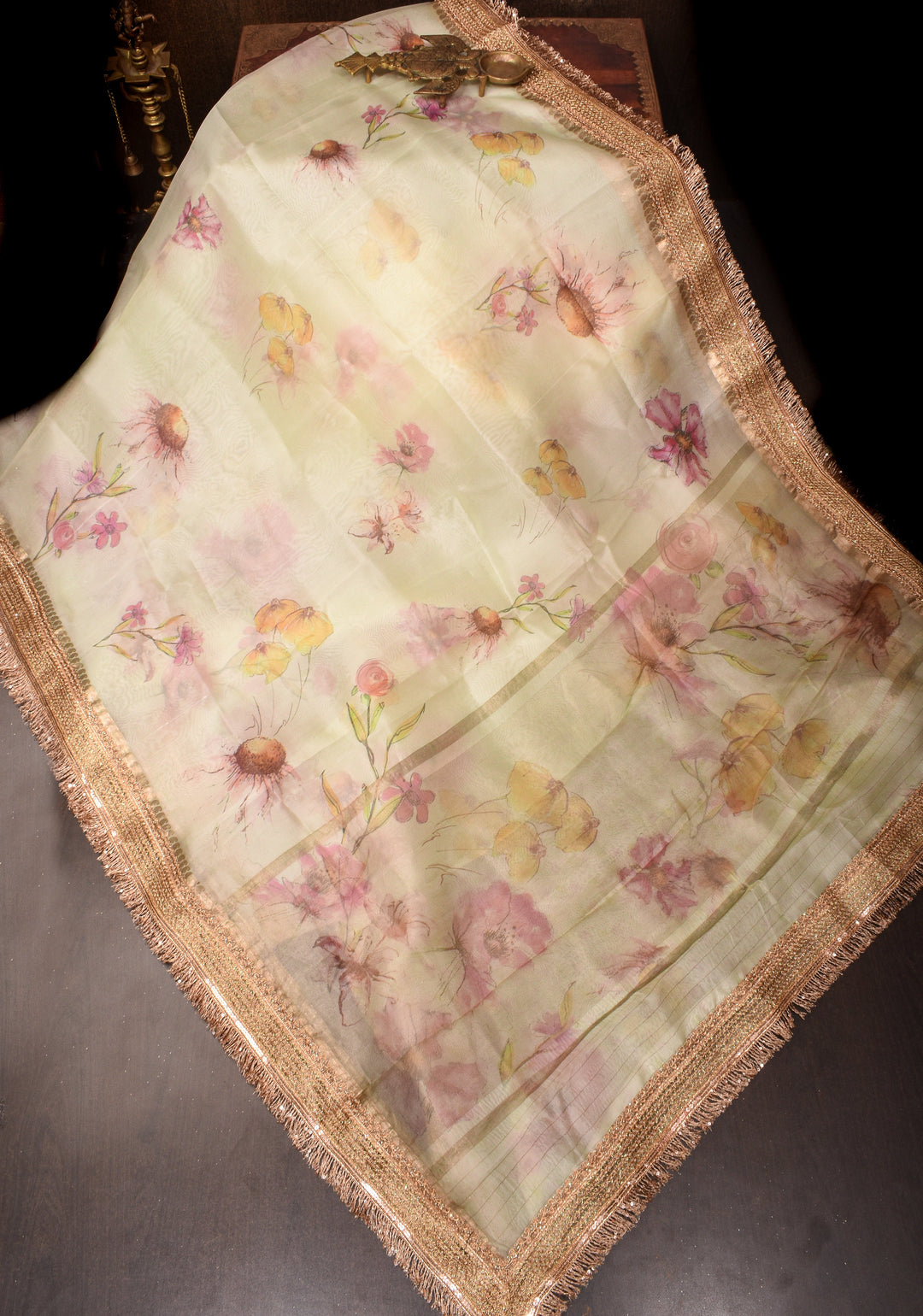 Avoid using a direct hot iron on zari or embroidered work, as excessive heat can dull the golden shine.