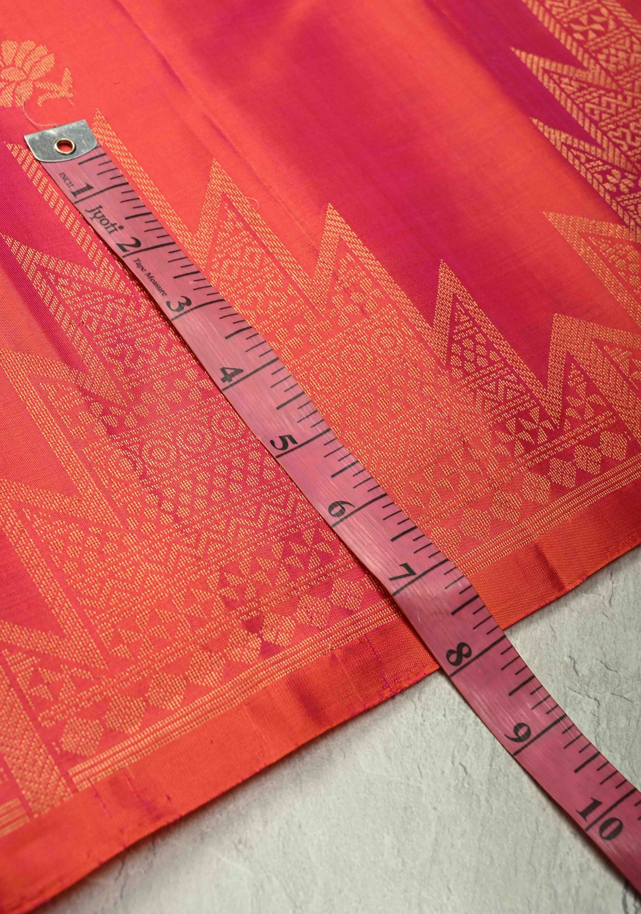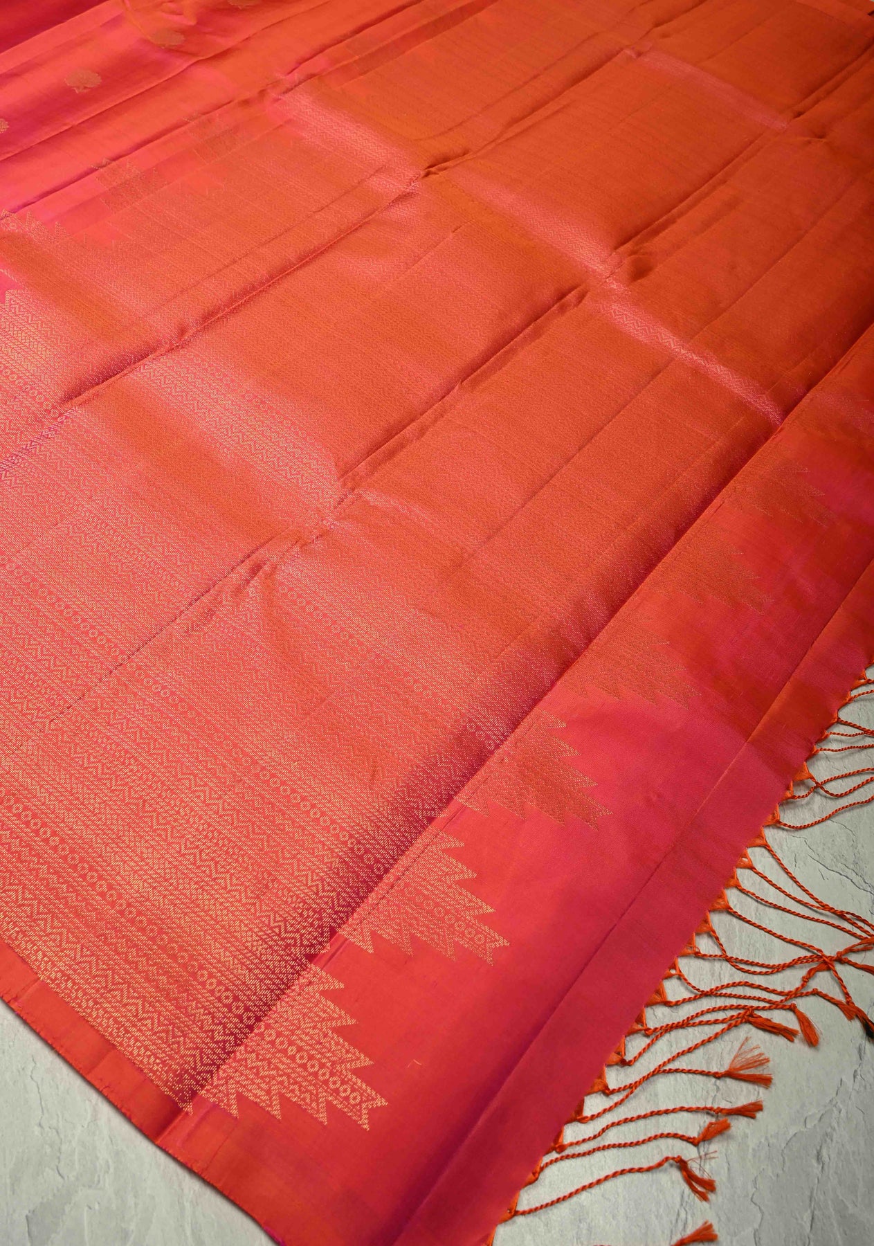 Embrace elegance with this Pink Dual Tone Kanjivaram Soft Silk Saree, adorned with intricate floral zari buttas and a classic temple-style zari border. Crafted from premium soft silk, this saree offers a smooth, lightweight drape with a luxurious sheen, perfect for adding grace and sophistication to your ethnic wardrobe.