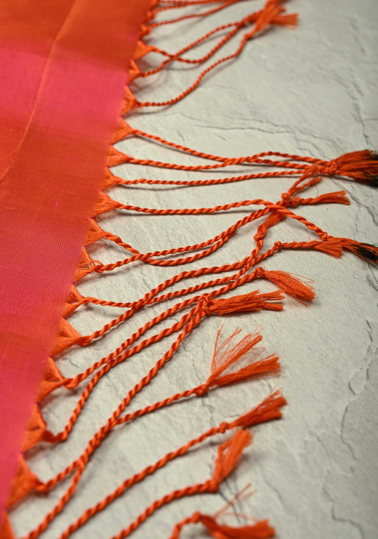 The dual-tone pink shade creates a mesmerizing visual appeal, while the delicate floral zari motifs enhance its traditional charm. Ideal for weddings, festivals, cultural events, and special occasions, this saree pairs beautifully with statement jewelry for a regal, handcrafted look.