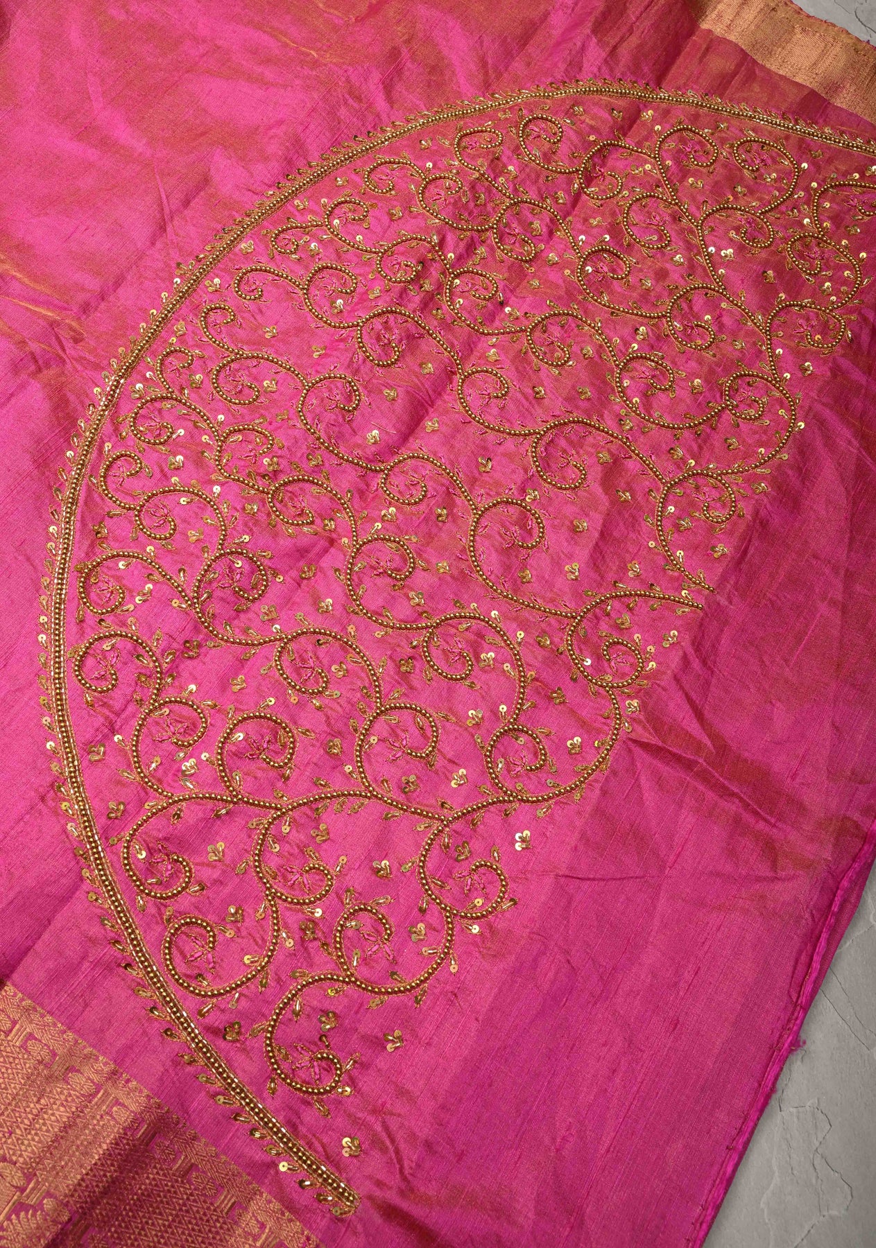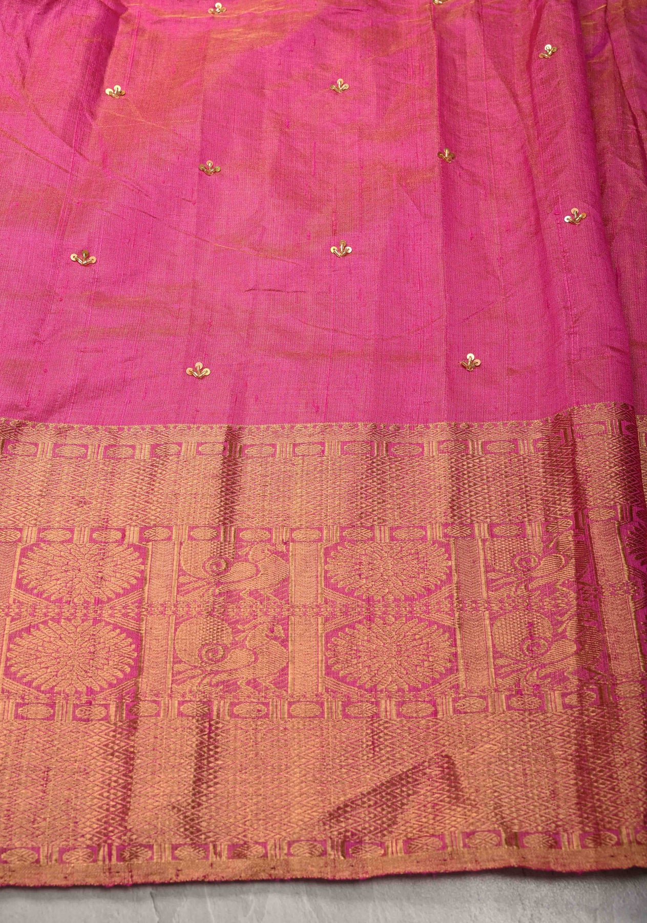 This Bright Pink Tissue Pure Raw Silk Kanjivaram Saree is a vibrant celebration of traditional elegance and exquisite craftsmanship. Crafted from pure raw silk with a delicate tissue finish, the saree dazzles in a striking pink shade that instantly catches the eye. The wide zari border adds a majestic touch, while intricate handwork featuring sequins, cutdana, and moti enhances the saree’s luxurious appeal with shimmering details. Perfect for weddings, festive occasions, and special celebrations, this saree promises to make you stand out with its rich heritage and dazzling artistry.