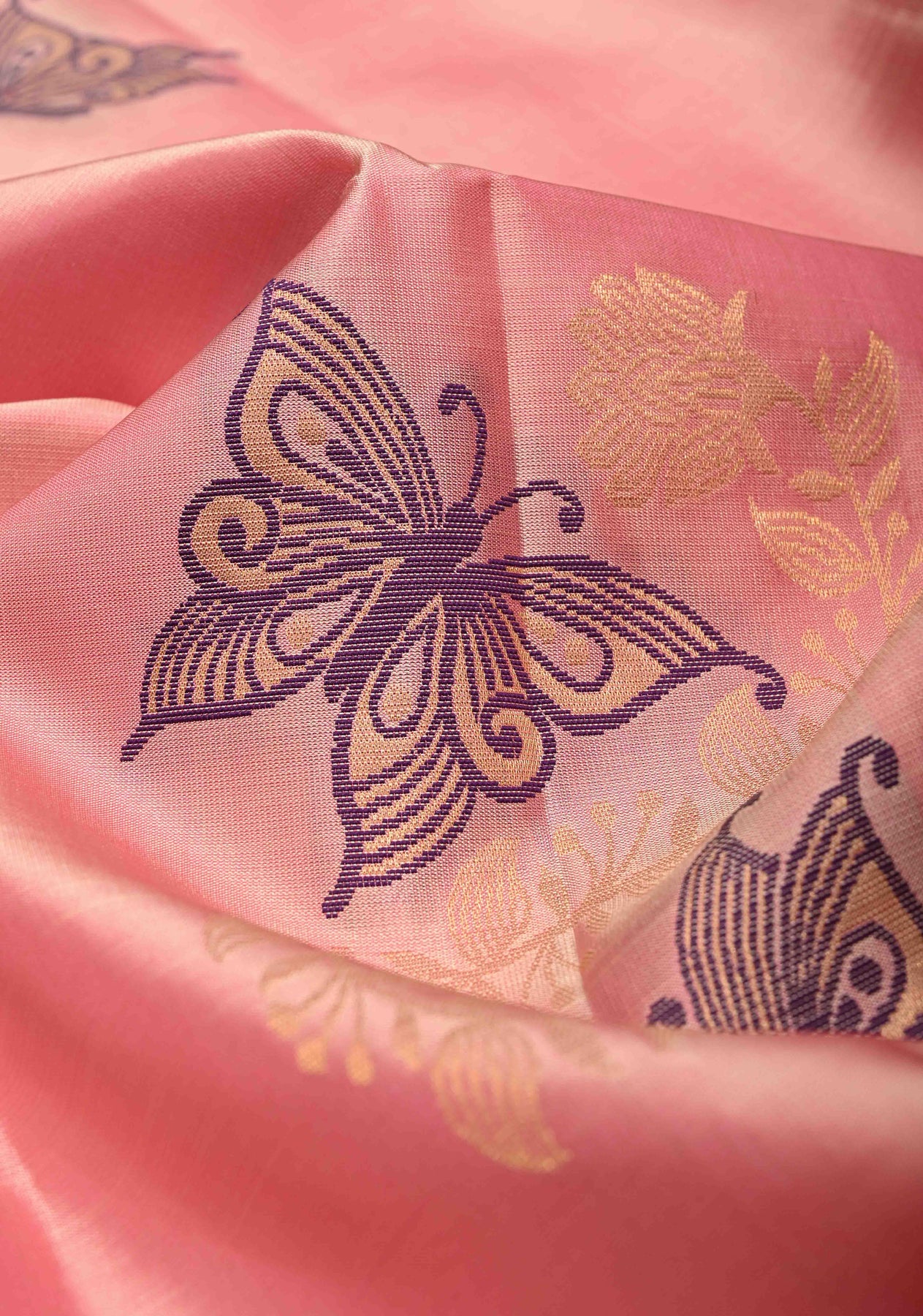 The Bubblegum Pink Dual Tone Borderless Kanjivaram Soft Silk Saree with Meenakari Butterfly and Floral Jaal is a graceful fusion of contemporary design and traditional craftsmanship. Woven from Kanjivaram soft silk, this saree showcases an intricate Meenakari butterfly and floral jaal, adding vibrant detailing and artistic elegance across the body. The borderless silhouette lends a modern, minimalist appeal, allowing the rich weaving to stand out beautifully.