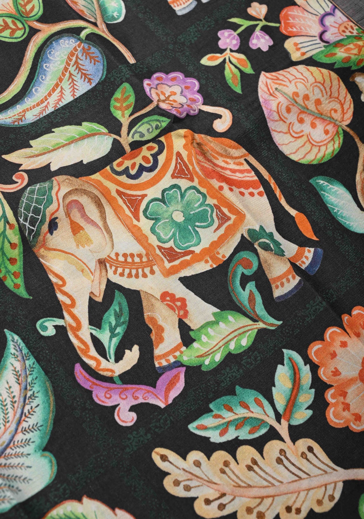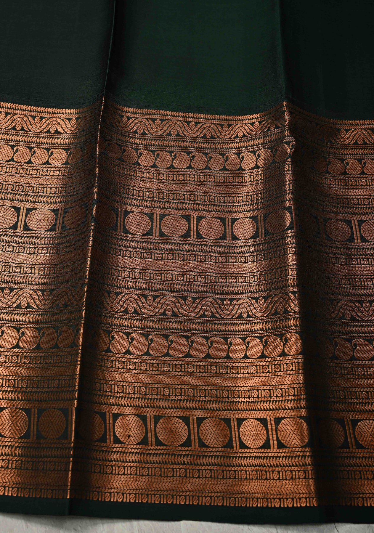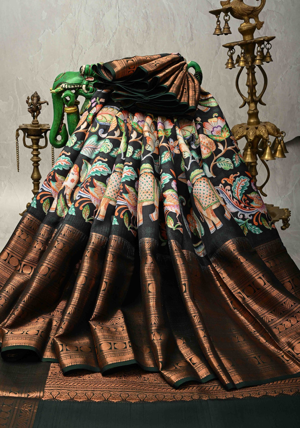 This Charcoal Black Pure Kanjivaram Silk saree showcases a refined blend of classic craftsmanship and contemporary design. The rich silk body is adorned with an elegant Kalamkari digital print, lending a structured yet artistic appeal to the saree. Complementing the dark base is a wide bottle green border woven with lustrous copper zari, adding depth, contrast, and a regal finish. Ideal for festive celebrations, and special occasions, this saree reflects timeless South Indian heritage with a modern aesthetic.