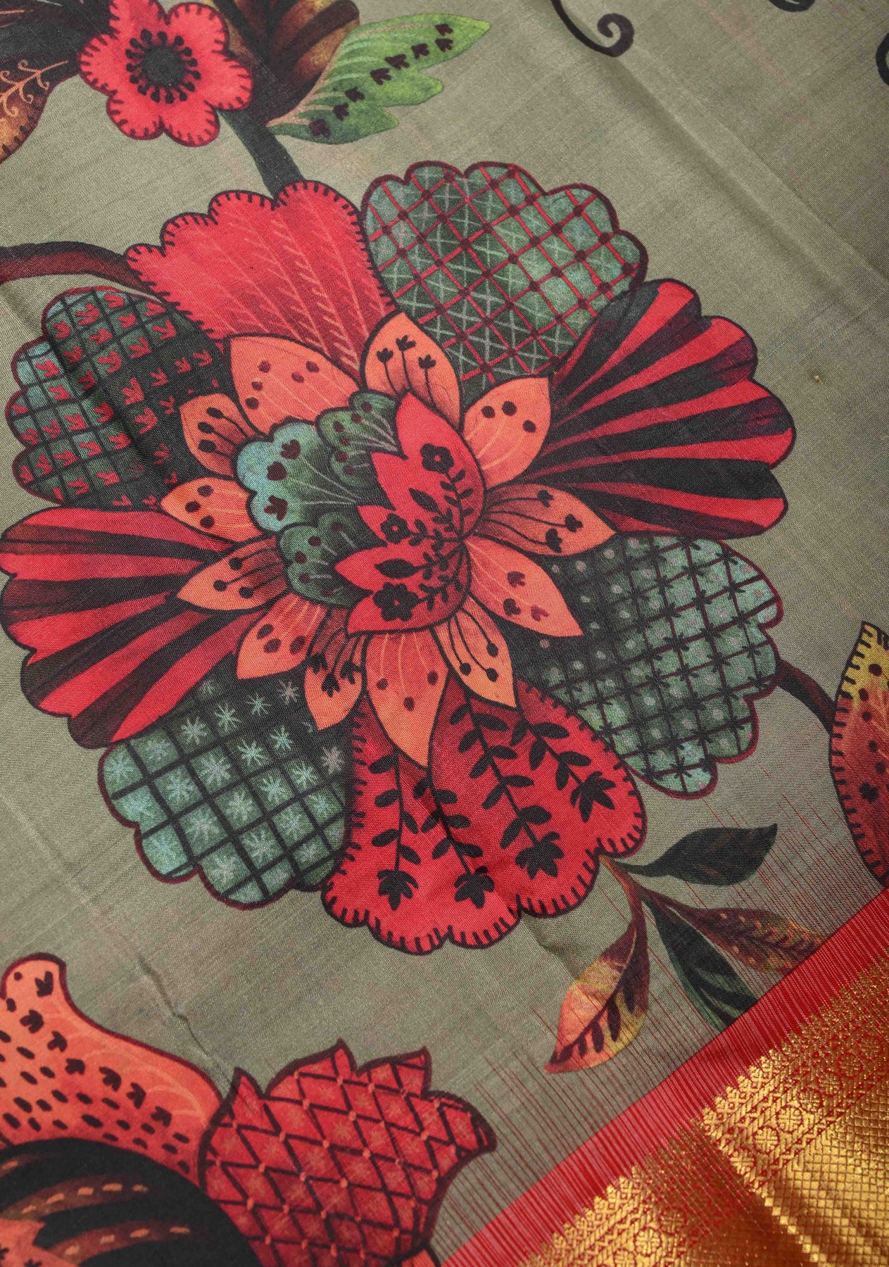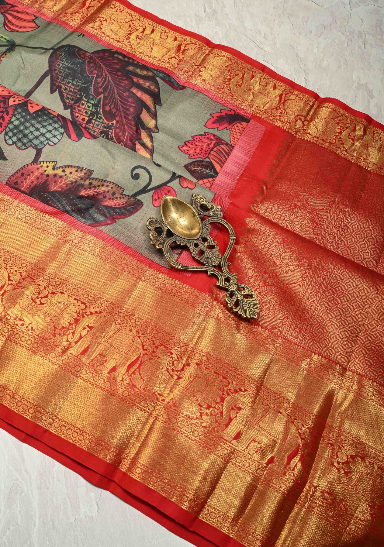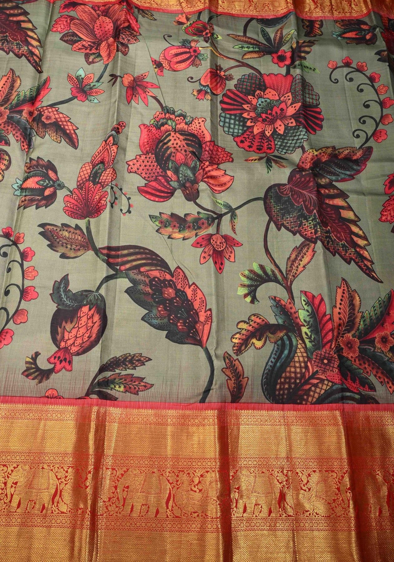 This dark sage green pure Kanjivaram silk saree embodies timeless elegance with a refined contemporary touch. Crafted from Kanjivaram silk, it features delicate floral digital prints that beautifully enhance the rich, earthy tone of the saree. The contrast wide zari border adds a regal finish, highlighting the saree’s traditional heritage. Its natural sheen and smooth drape create a graceful silhouette. Ideal for weddings, festive celebrations, and special occasions, this saree is a perfect blend of classic craftsmanship and modern design.