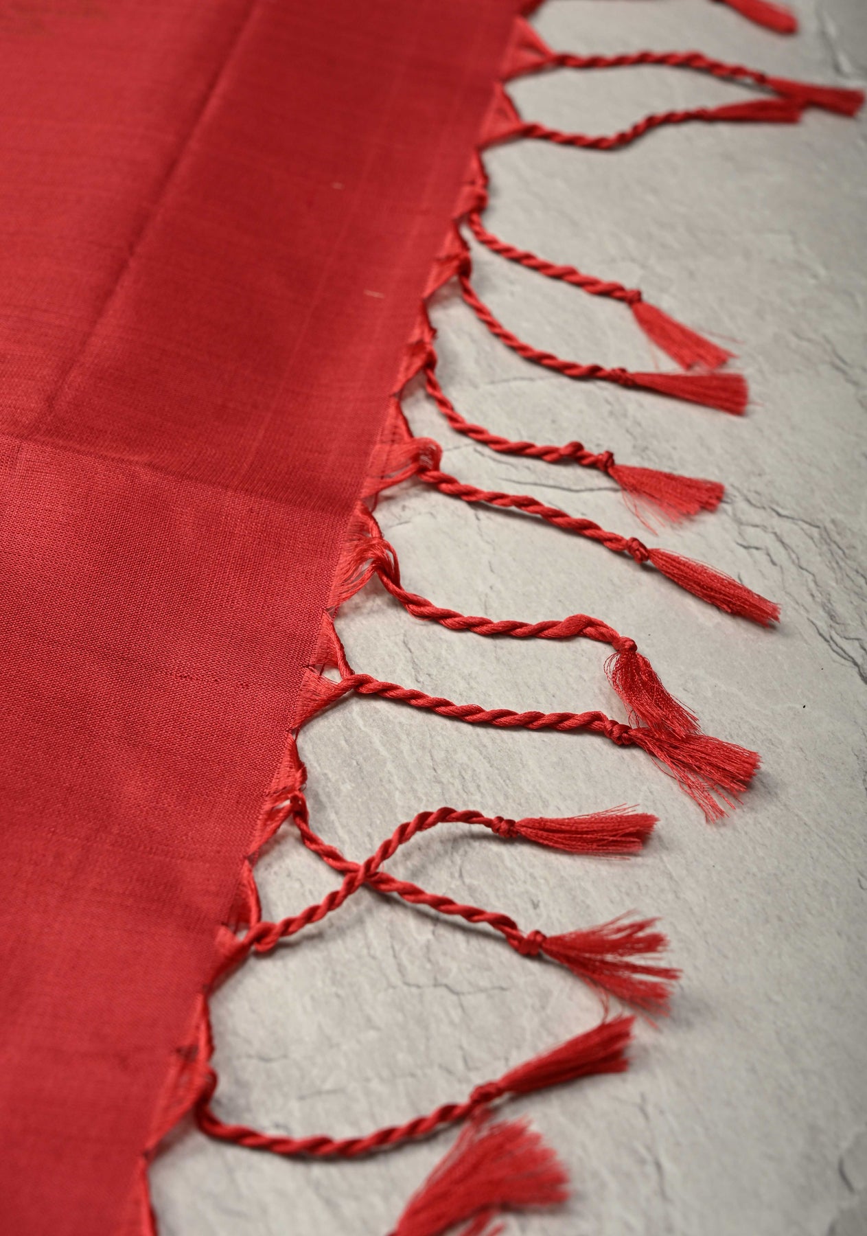 This saree is ready to wear with fall and pico done. Handmade silk tassels as seen in the pic adorn the pallu and add more grace to it. An unstitched blouse fabric is included.