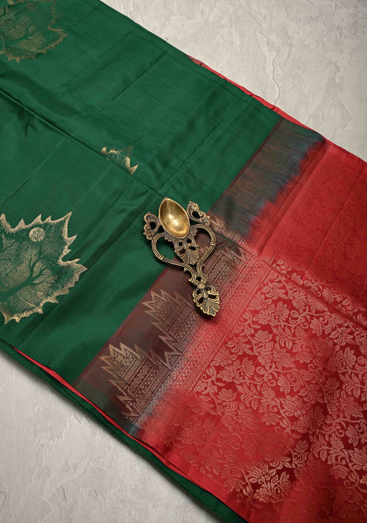 Maple Leaf Buttas Deep Forest Green Borderless Kanjivaram Soft Silk Saree and Contrast Pallu | SILK MARK CERTIFIED
