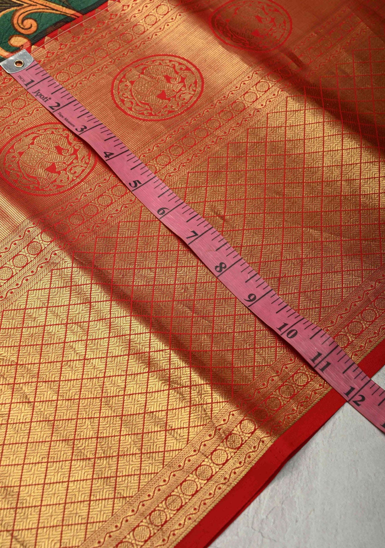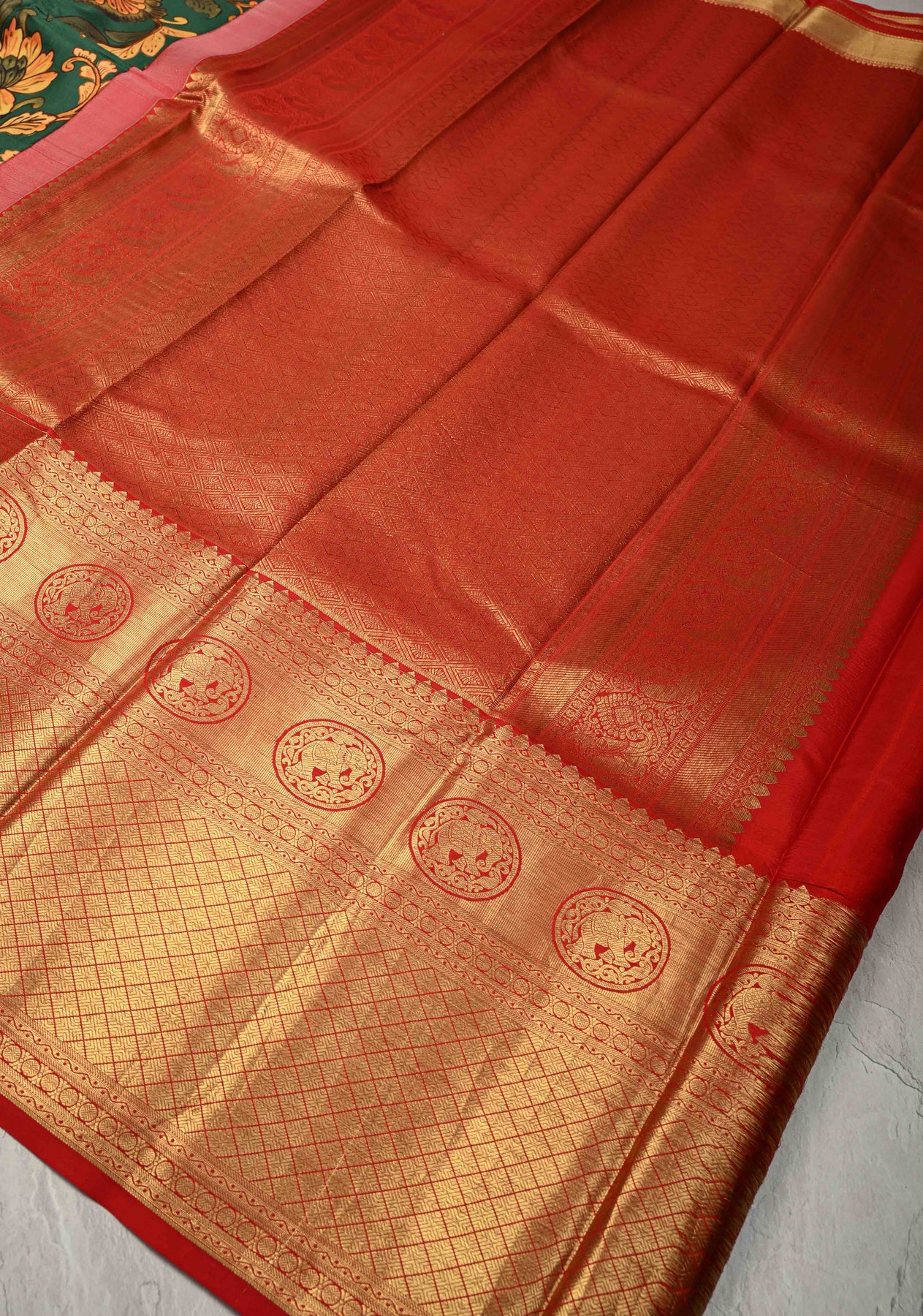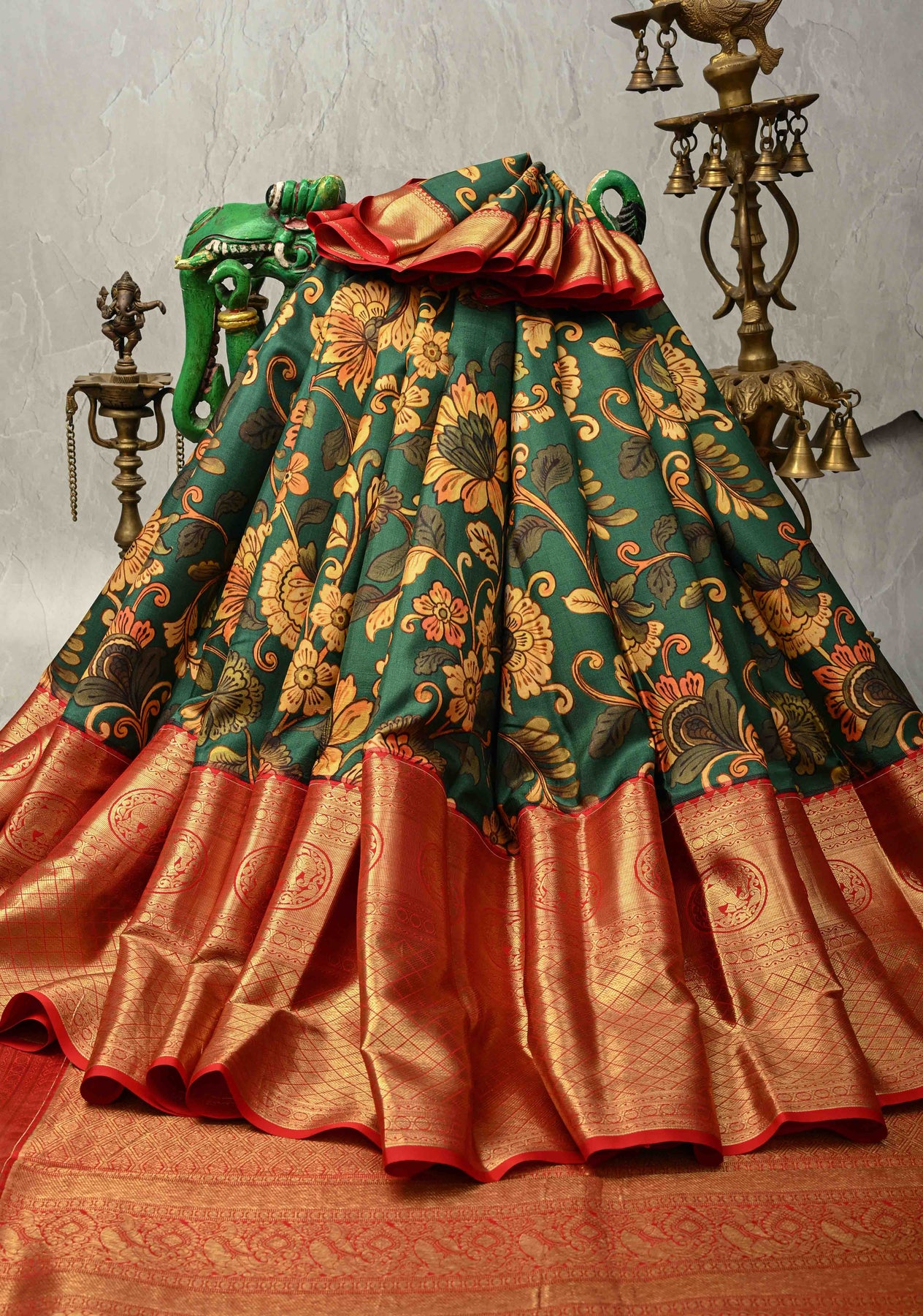 This deep Rama green pure Kanjivaram silk saree beautifully blends classic luxury with artistic detailing. Featuring an exquisite Kalamkari floral digital print across the body, it adds a rich, traditional charm to the green base. The saree is elevated with a wide contrast zari border that enhances its regal appeal and showcases fine craftsmanship. Made from lustrous pure silk, this saree is a perfect choice for weddings, festive occasions, and grand celebrations where elegance and heritage take center stage.