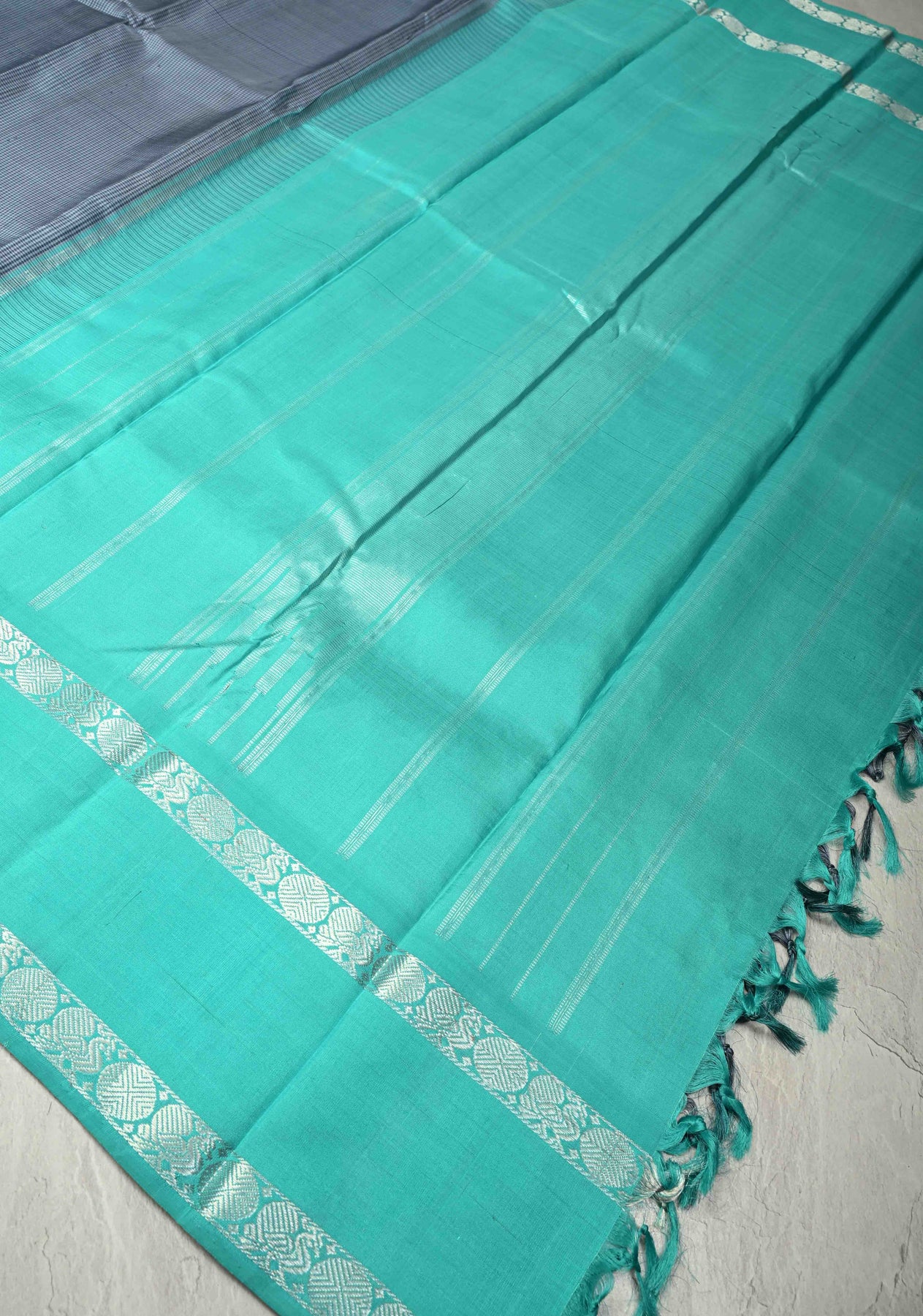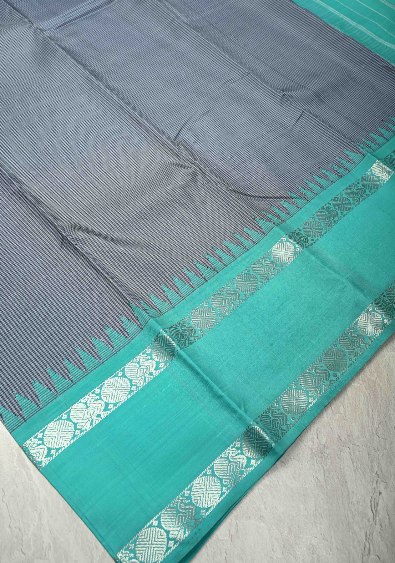 This sophisticated gray handloom pure silk Kanchipattu saree blends contemporary style with traditional craftsmanship. The silk body features elegant gingham checks that add texture and modern charm, while the contrast Rettaipet border enhances the saree with striking definition and timeless appeal. Finished with a finely woven pallu and matching blouse, this saree is perfect for weddings, festive occasions, and formal gatherings, reflecting the exquisite artistry of Kanchipuram handloom silk.