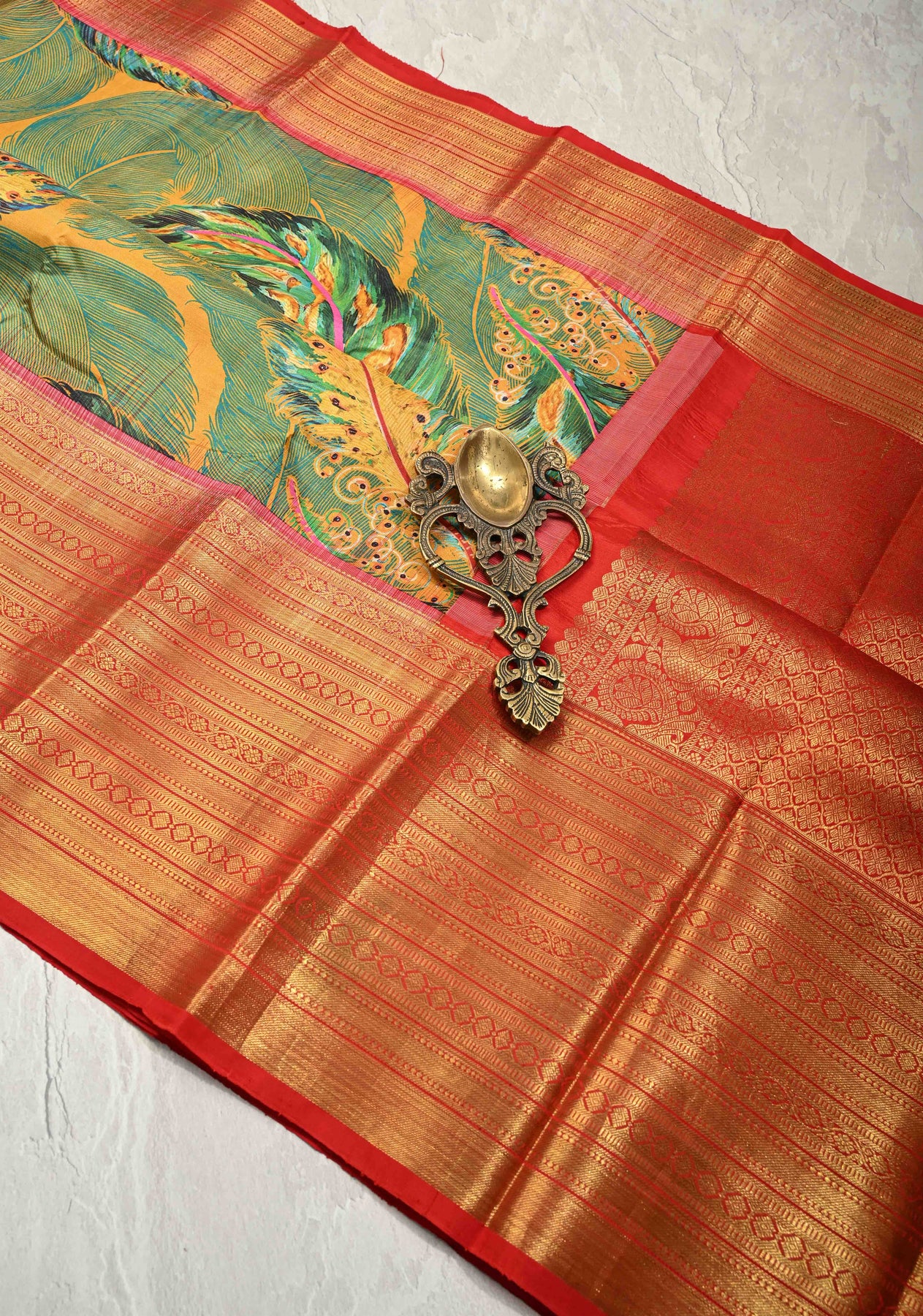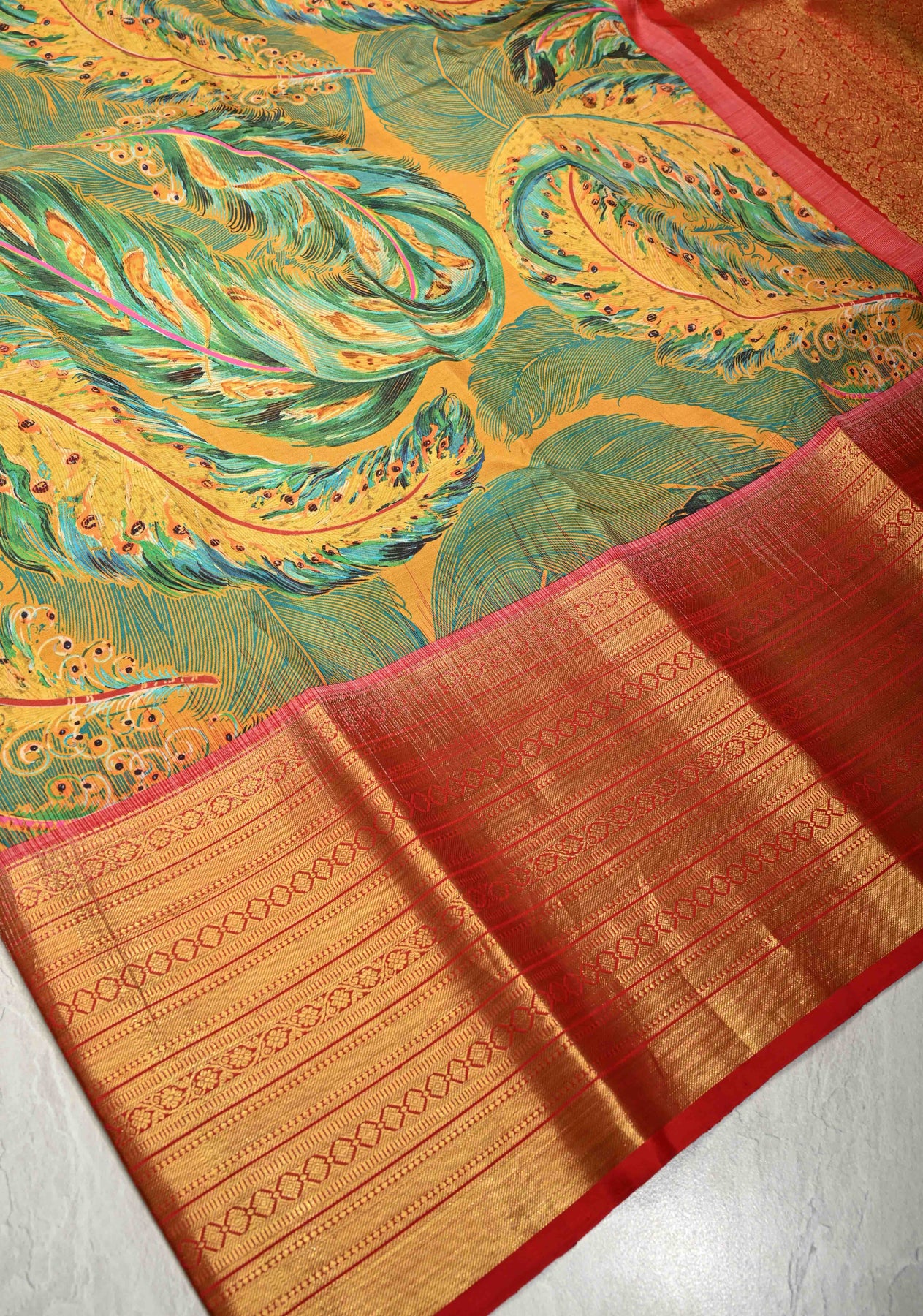 This green-mustard pure Kanjivaram silk saree is a striking fusion of vibrant tones and artistic elegance. Crafted from Kanjivaram silk, it features abstract digital prints inspired by peacock feathers, adding a contemporary and graceful touch to the dual-toned base. The contrast wide zari border enhances the saree’s traditional grandeur, giving it a bold and regal finish. With its smooth texture, natural sheen, and elegant drape, this saree stands out effortlessly. Ideal for weddings, festive celebrations, and cultural occasions, it beautifully blends timeless craftsmanship with modern design.