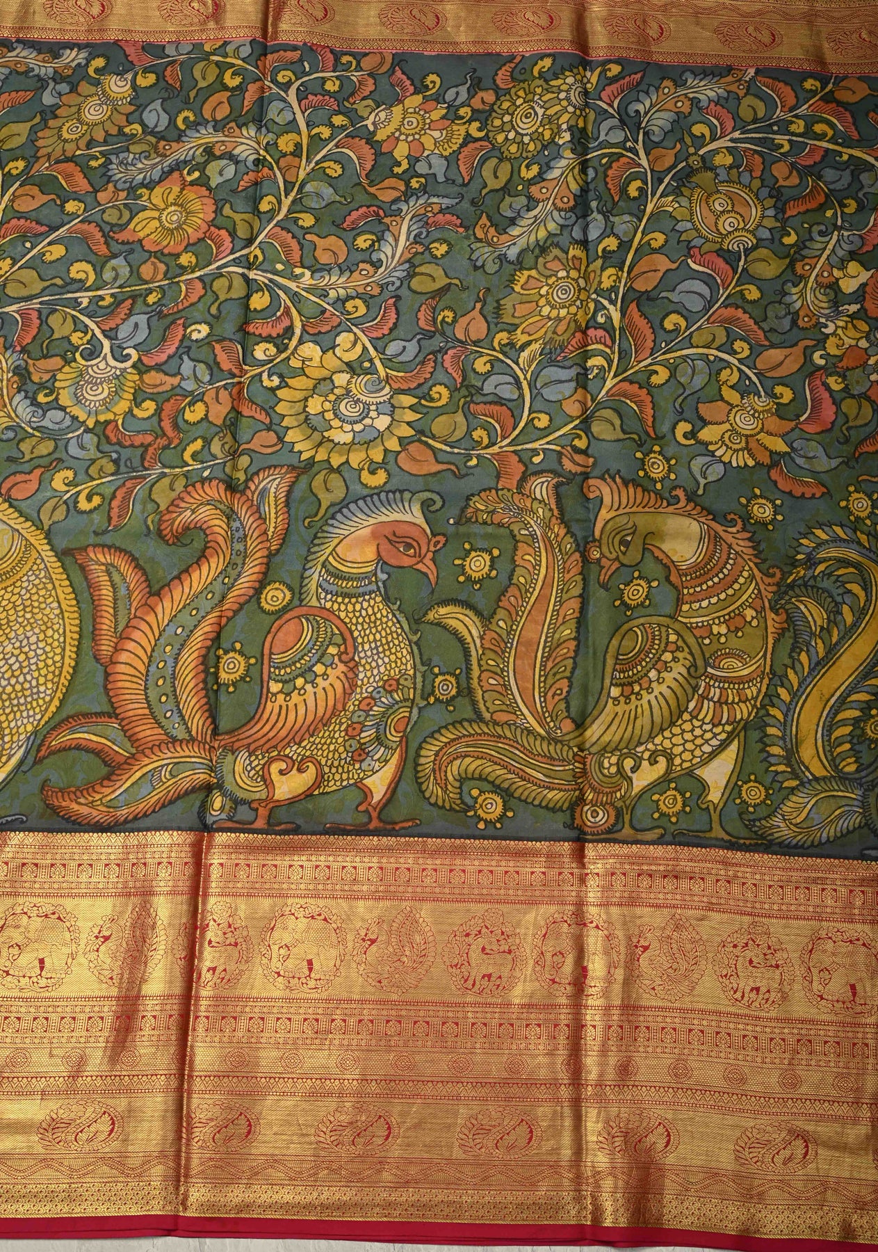This stunning pure Kanjivaram silk saree in a rich greenish blue hue showcases an exquisite peacock and floral theme, authentically hand-painted using traditional pen Kalamkari artistry. The intricate motifs highlight timeless craftsmanship, adding depth and cultural elegance to the luxurious silk fabric. Accentuated with a wide contrast zari border, the saree exudes regal charm and grandeur. Perfect for weddings, festive celebrations, and special occasions, this saree is a beautiful blend of heritage art and classic sophistication.