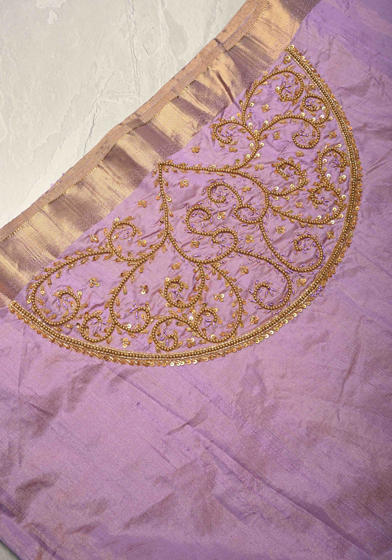 Lilac Tissue Pure Raw Silk Kanjivaram Saree with Wide Zari Border and Sequins, Cutdana Moti Hand Work | SILK MARK CERTIFIED