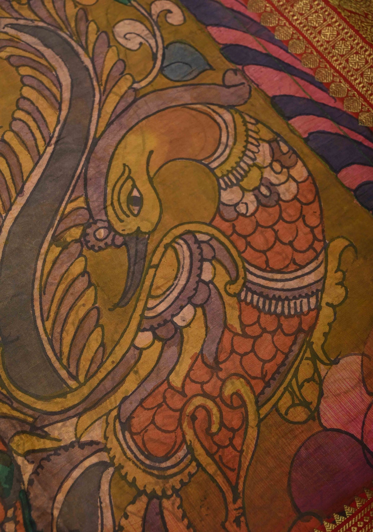 Note:This is an authentic Pen kalamkari product is made using multiple steps, including boiling the dupatta in Buffalo milk etc. This causes creasing on the zari and also leaves an organic smell, both of which are characteristic of this method and attest to its authenticity, They are not considered as defects.