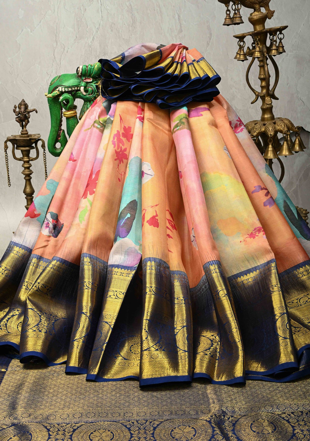 Pastel Hued Pure Kanjivaram Silk Saree with Floral Digital Print and Contrast Wide Zari Border | SILK MARK CERTIFIED