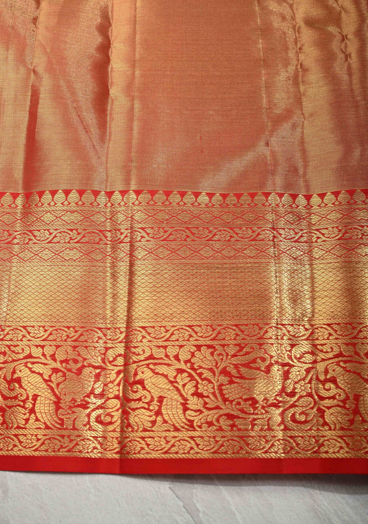 The Pink-Gold Dual Tone Tissue Kanjivaram Pure Silk Saree with Meenakari Floral Jaal Brocade and Zari Border is an exquisite blend of traditional craftsmanship and royal elegance. Woven from authentic Kanjivaram pure silk tissue, this saree features an intricate Meenakari floral jaal brocade, adding vibrant detailing, texture, and timeless charm. The classic zari border enhances its grandeur, reflecting the luxury and heritage of South Indian weaving.