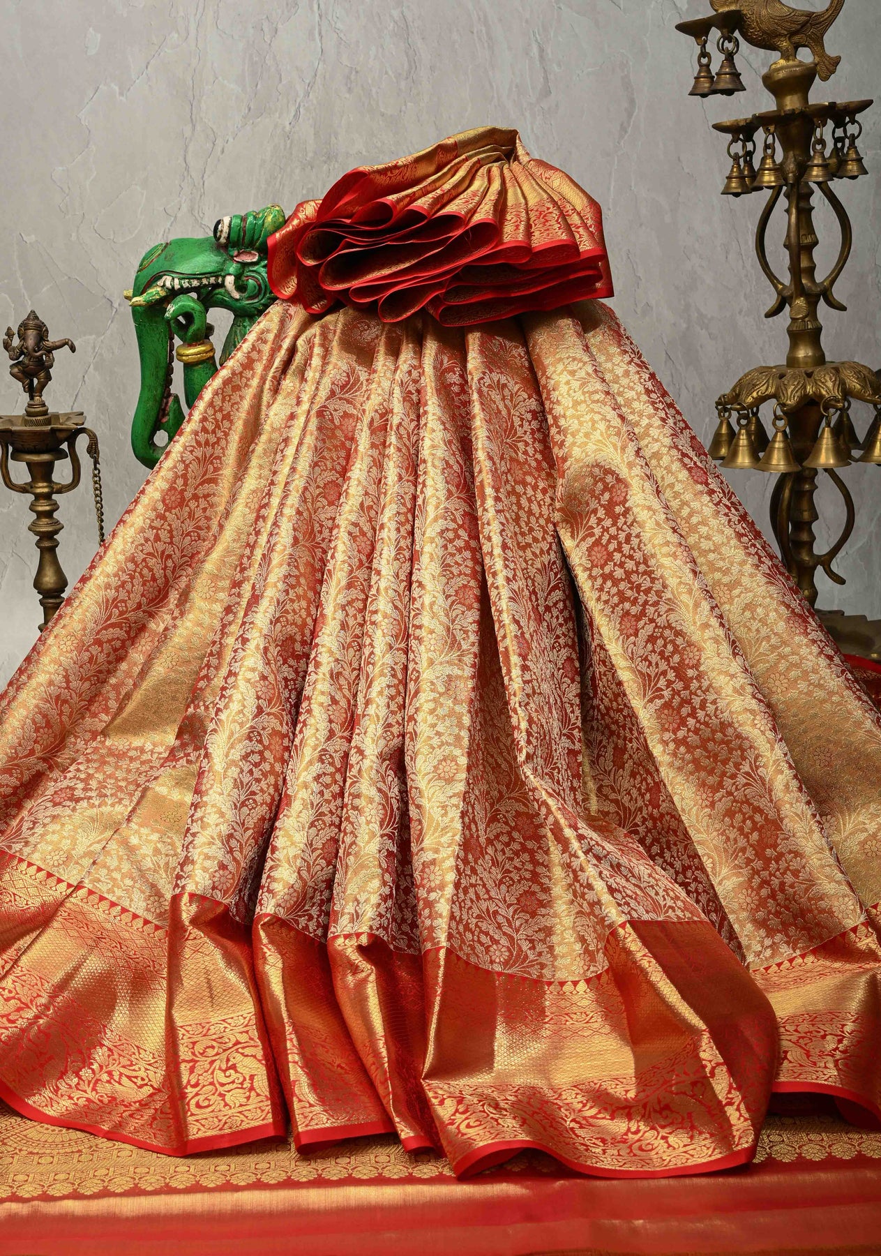 The dual-tone pink and gold palette exudes festive splendor and feminine sophistication, making this saree perfect for weddings, bridal wear, festive celebrations, and special occasions. With its luminous sheen, structured drape, and opulent texture, it creates a majestic silhouette. Pair it with traditional gold or antique jewelry to complete a regal and elegant look.