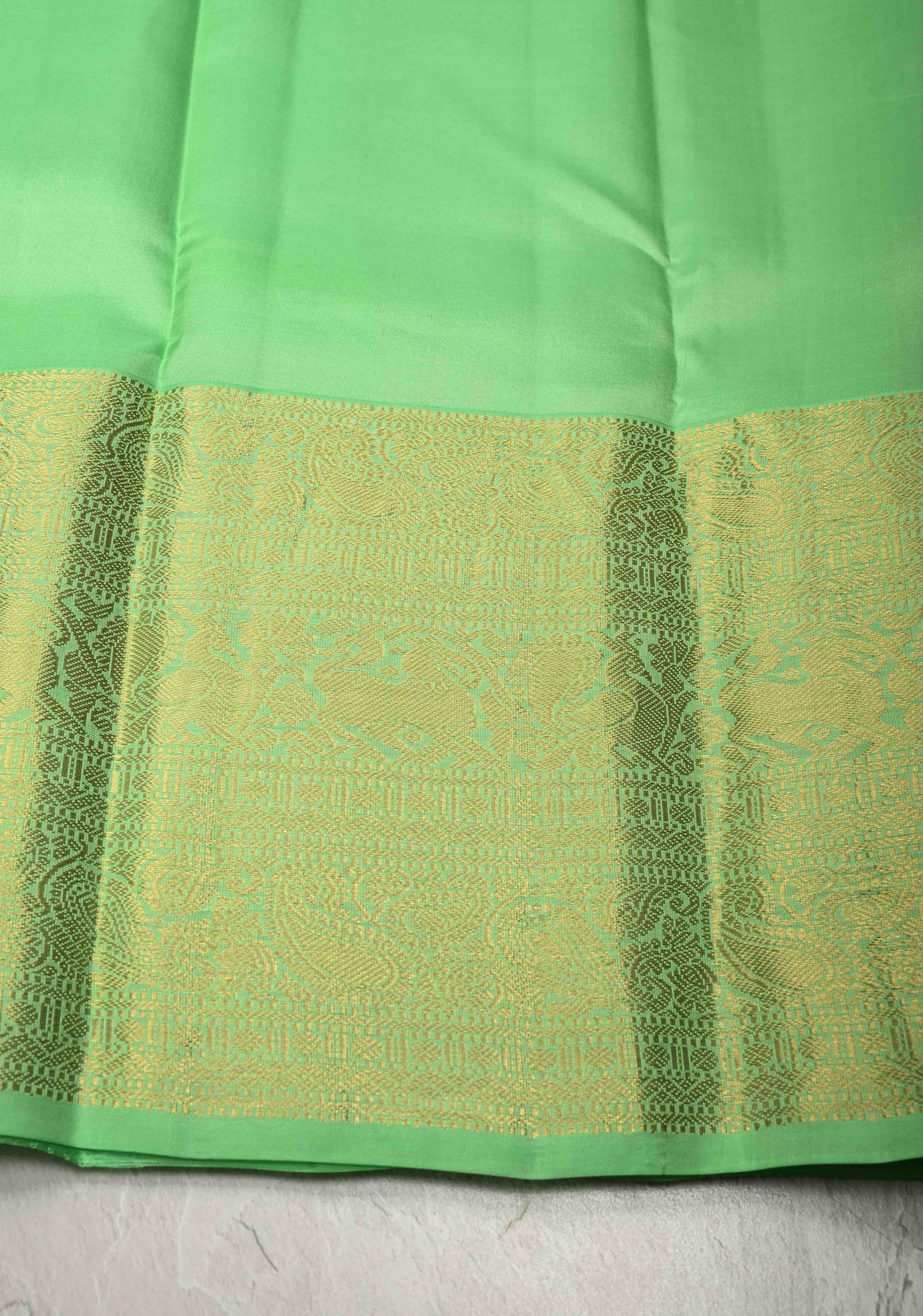 Make a bold and majestic statement with this Rani Pink Kanjivaram Pure Silk Saree, featuring the mythical Ganda Berunda motif — a symbol of strength and protection in South Indian tradition. Crafted from the finest pure silk, the saree is adorned with intricately woven zari buttas of the double-headed eagle, scattered gracefully across the rich pink body. A striking contrast wide zari border enhances its grandeur, perfectly balancing tradition with elegance. Ideal for weddings, temple functions, or festive occasions, this saree is a true representation of regal heritage and timeless craftsmanship.