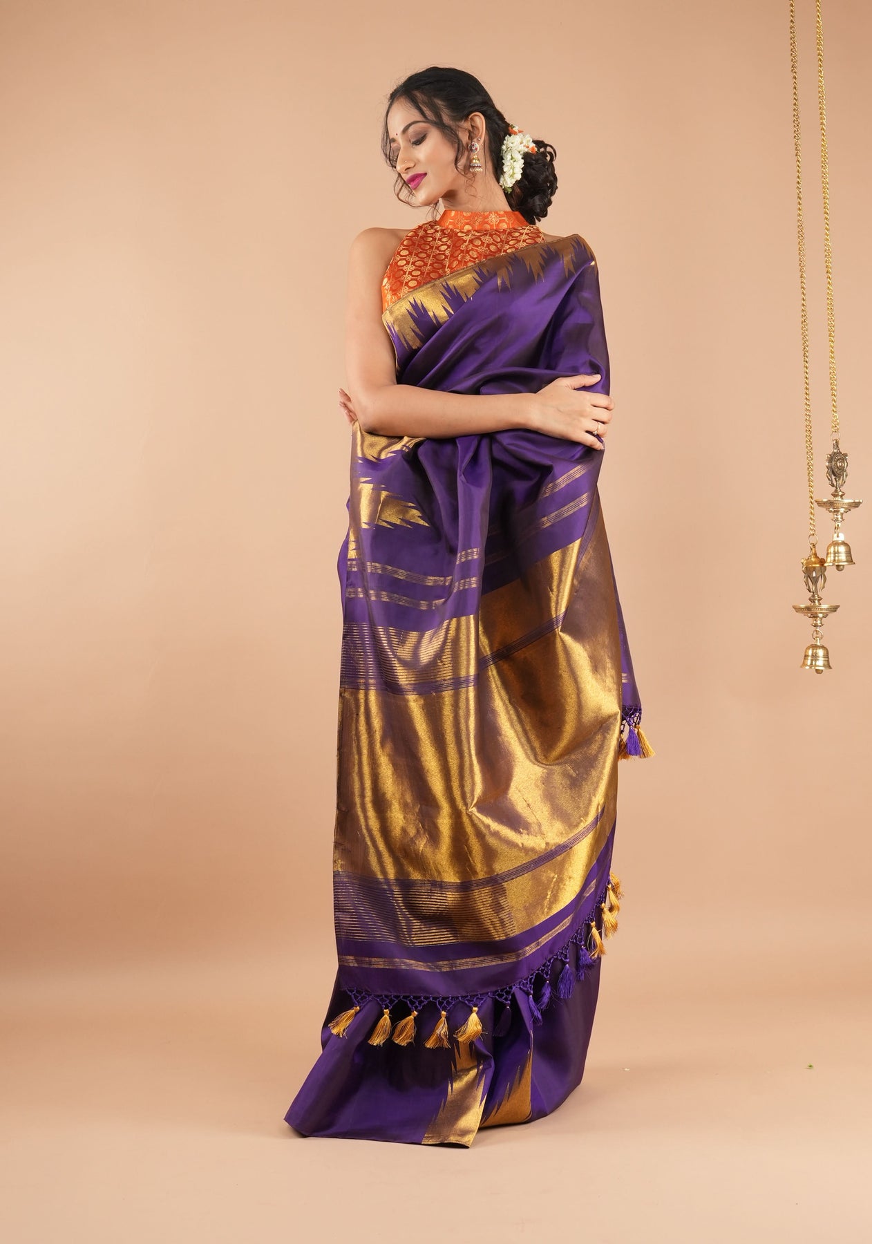 Dark Purple tone Kanjivaram Silk Saree with Antique gold Zari Temple border | SILK MARK CERTIFIED