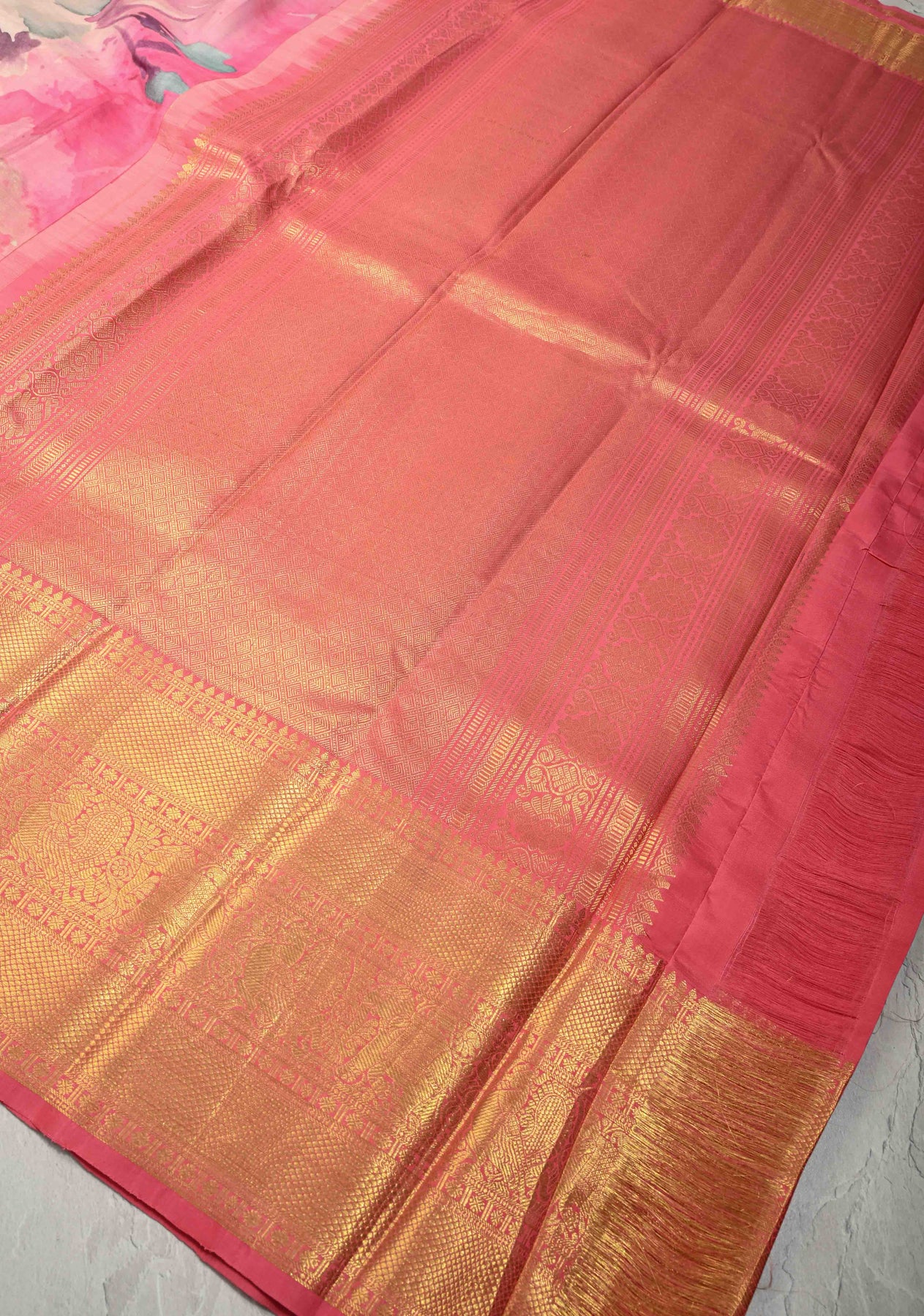 This Watercolor Pure Kanjivaram Silk Saree is a beautiful fusion of artistic expression and traditional elegance. The saree features soft, watercolor-inspired floral digital prints that create a delicate and graceful visual appeal on the luxurious silk base. A finely woven zari border adds classic richness, perfectly complementing the contemporary floral artwork. Crafted from pure Kanjivaram silk, it offers a smooth texture and an elegant, fluid drape. Ideal for weddings, festive occasions, and refined celebrations, this saree stands out with its unique blend of modern design and heritage craftsmanship. The soothing color palette lends it a timeless and sophisticated charm. A perfect choice for those who appreciate subtle luxury with artistic flair.
