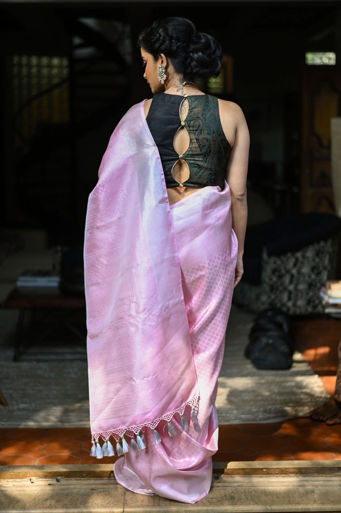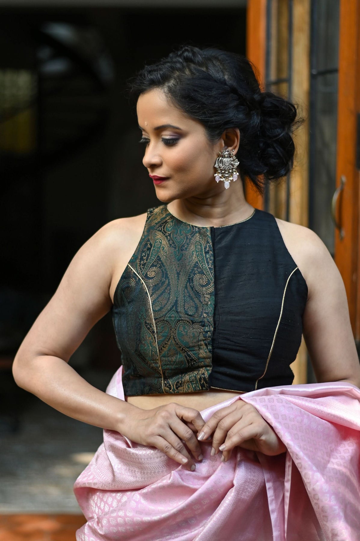 Crafted with Raw Silk fabric and Banarasi Brocade with a dash of gold piping and buttons, this blouse comes in a eye-catching pattern!