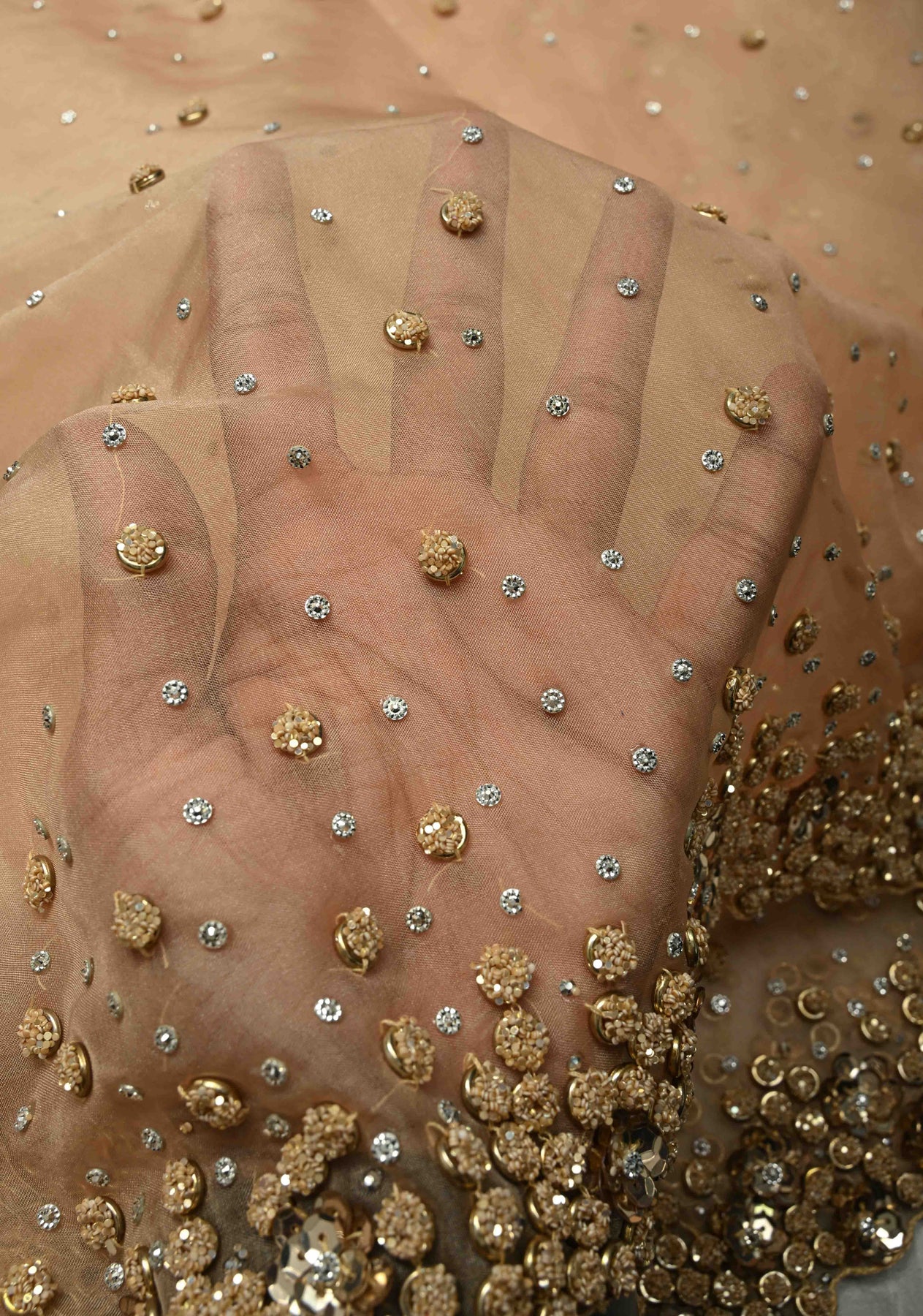 Chiku Color Embellished Organza Saree with Stone, Sequins and Contemporary Scallop Border