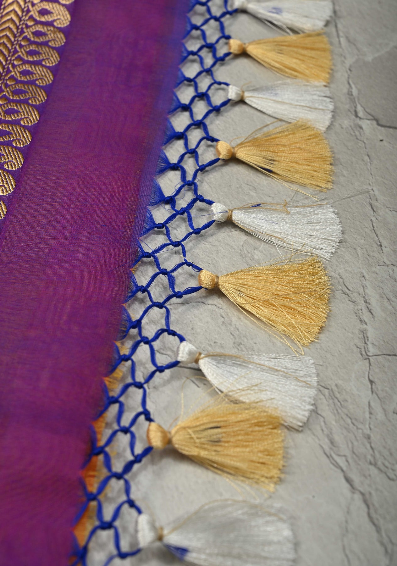 This saree is ready to wear with fall and pico done. Handmade silk tassels adorn the pallu and add more grace to it. An unstitched blouse fabric is included.