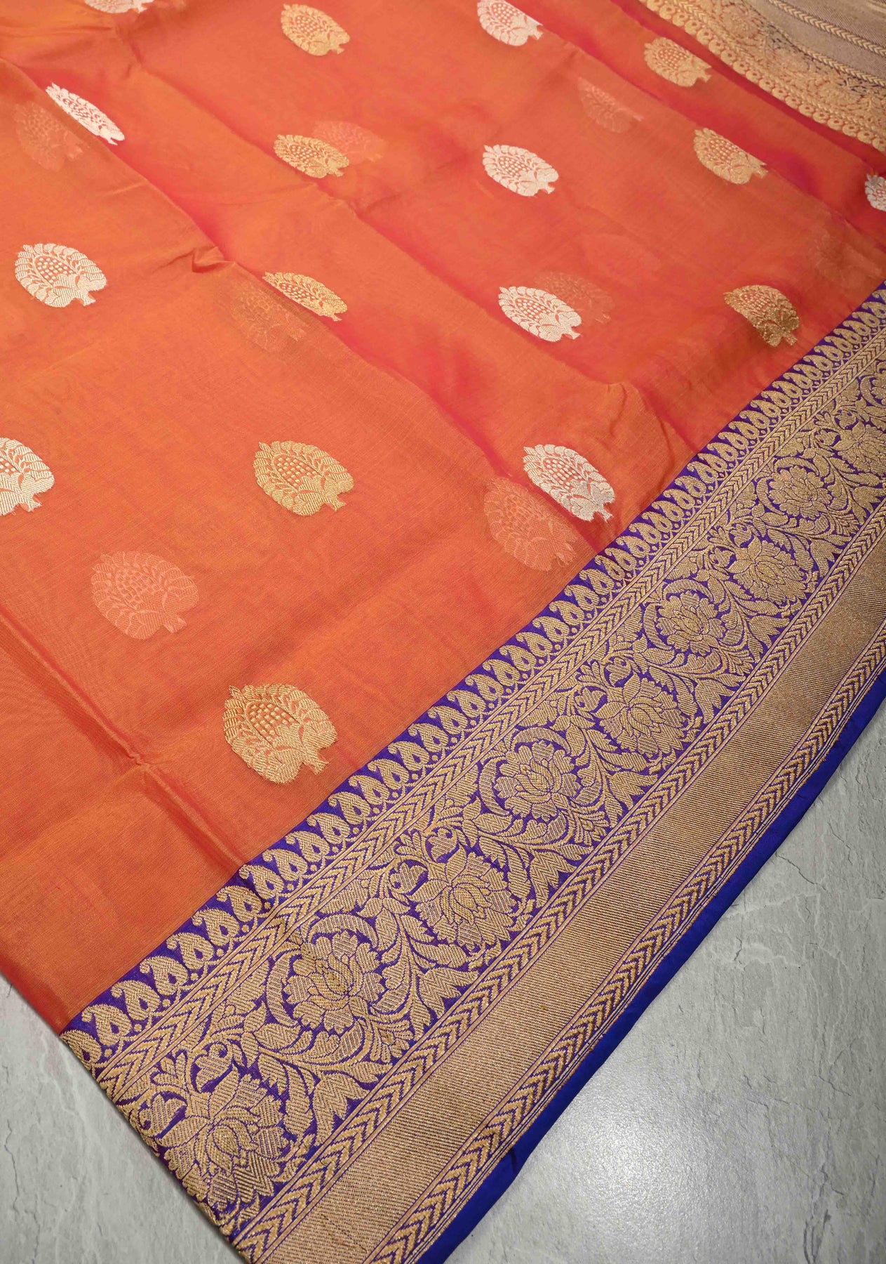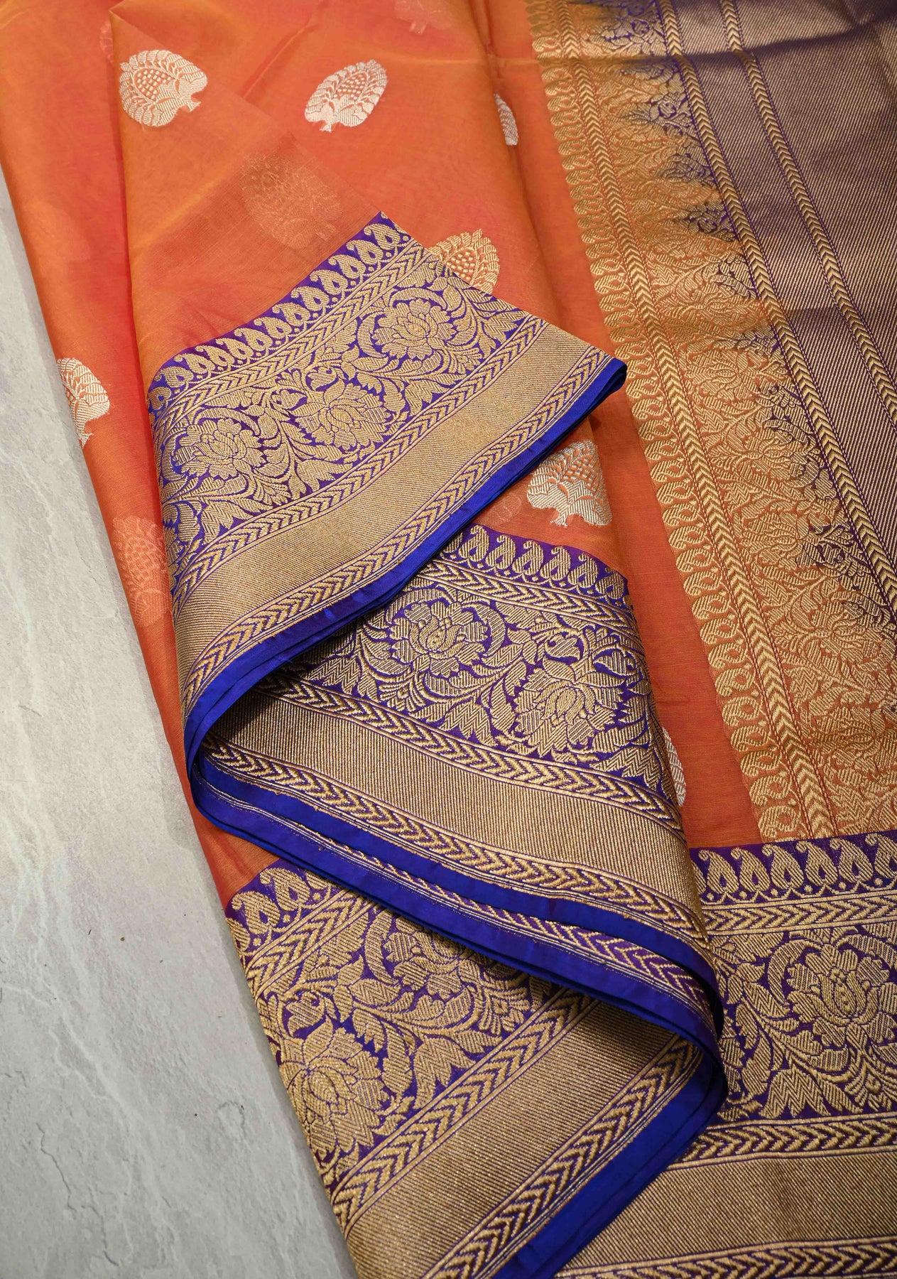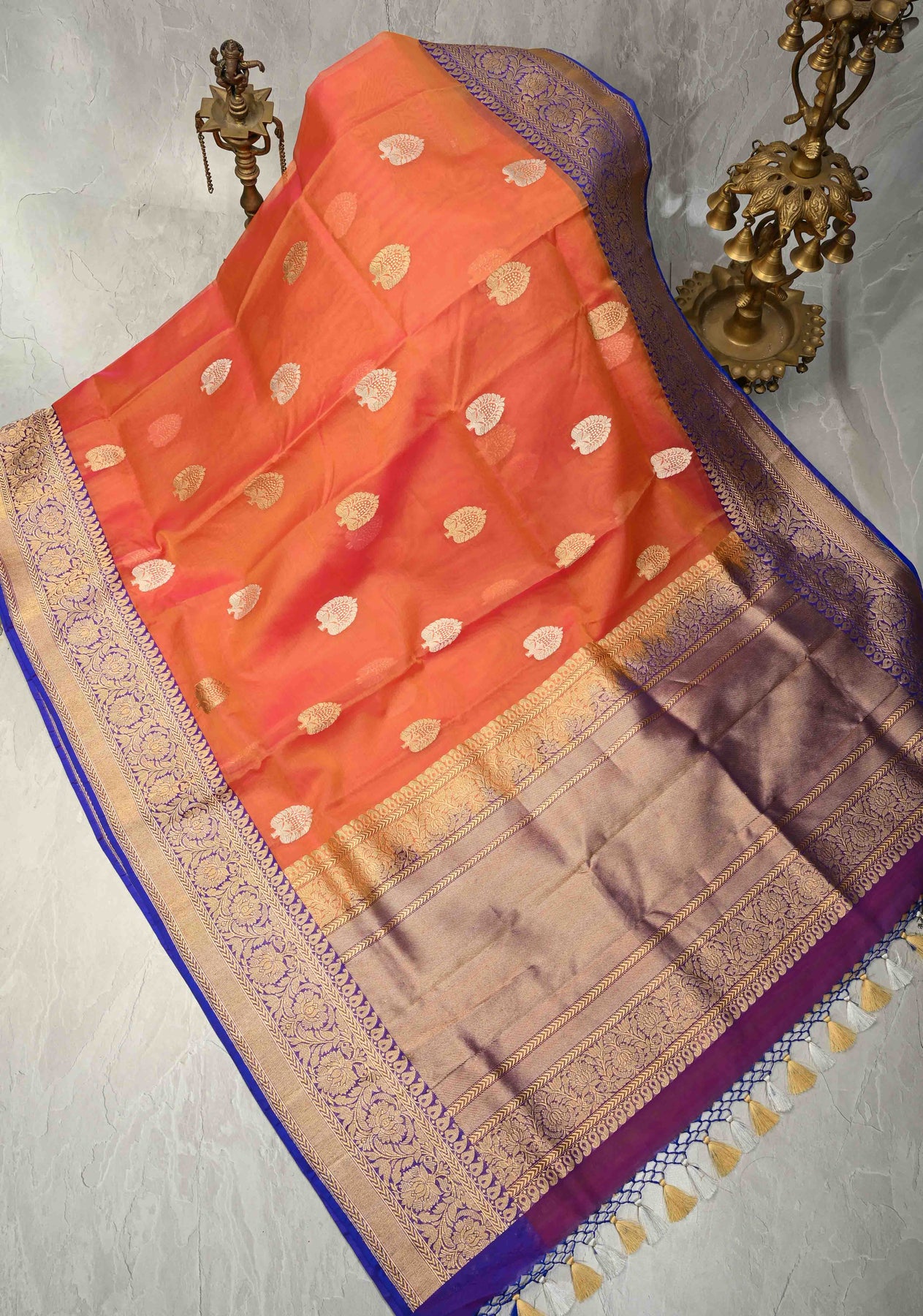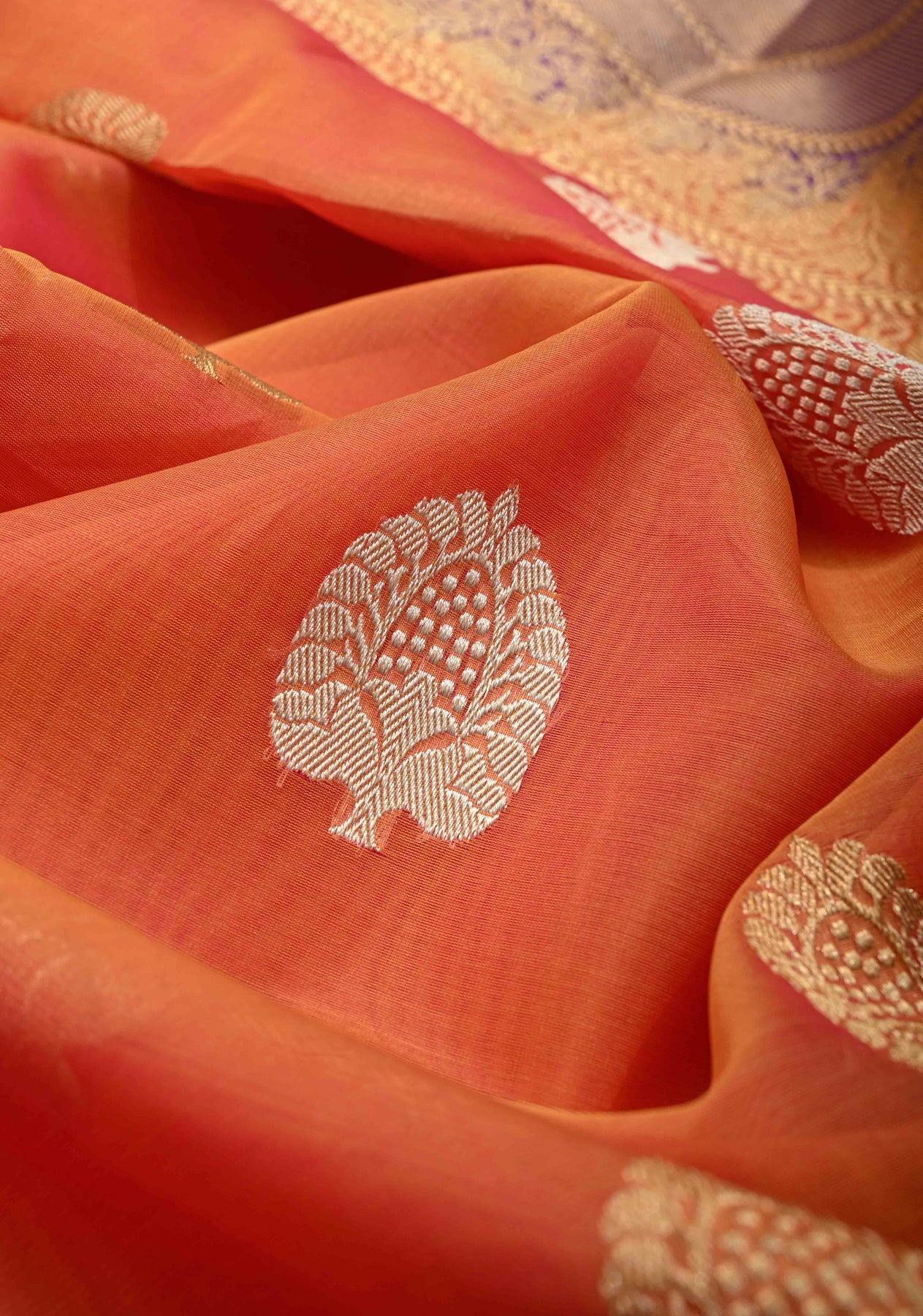 Kesari Orange Dual tone Banarasi Kora Silk Saree with Sona Rupa Buttas and Contrast Zari Border | SILK MARK CERTIFIED