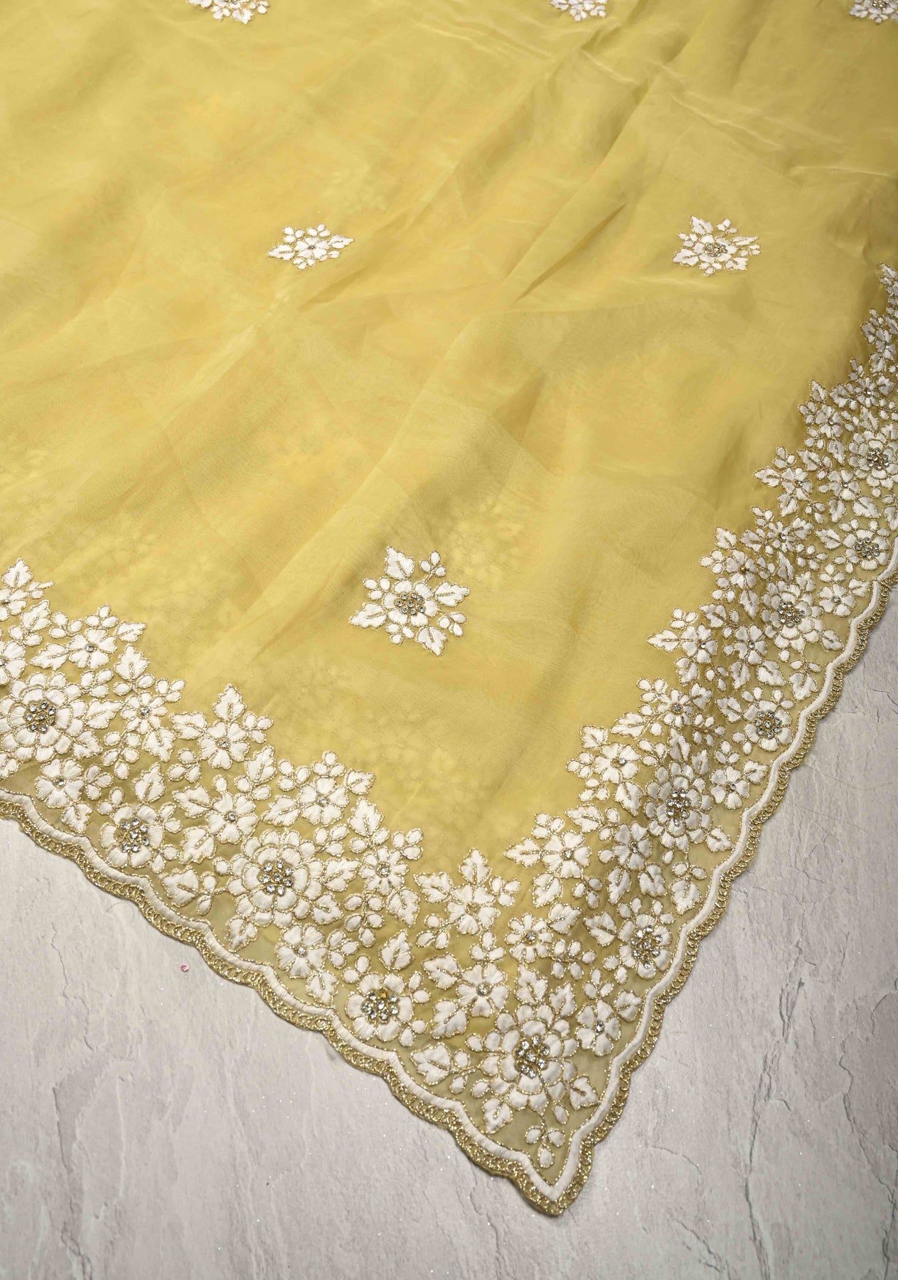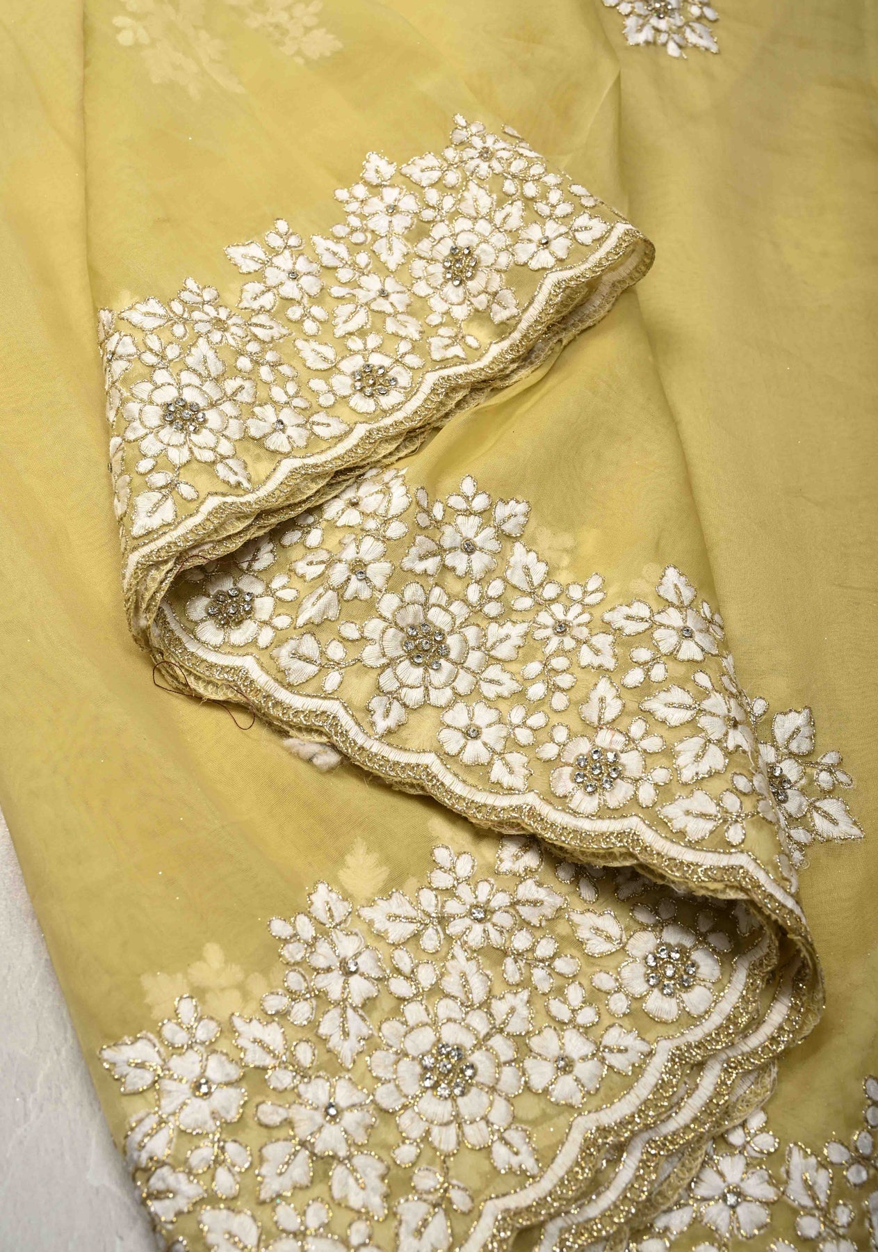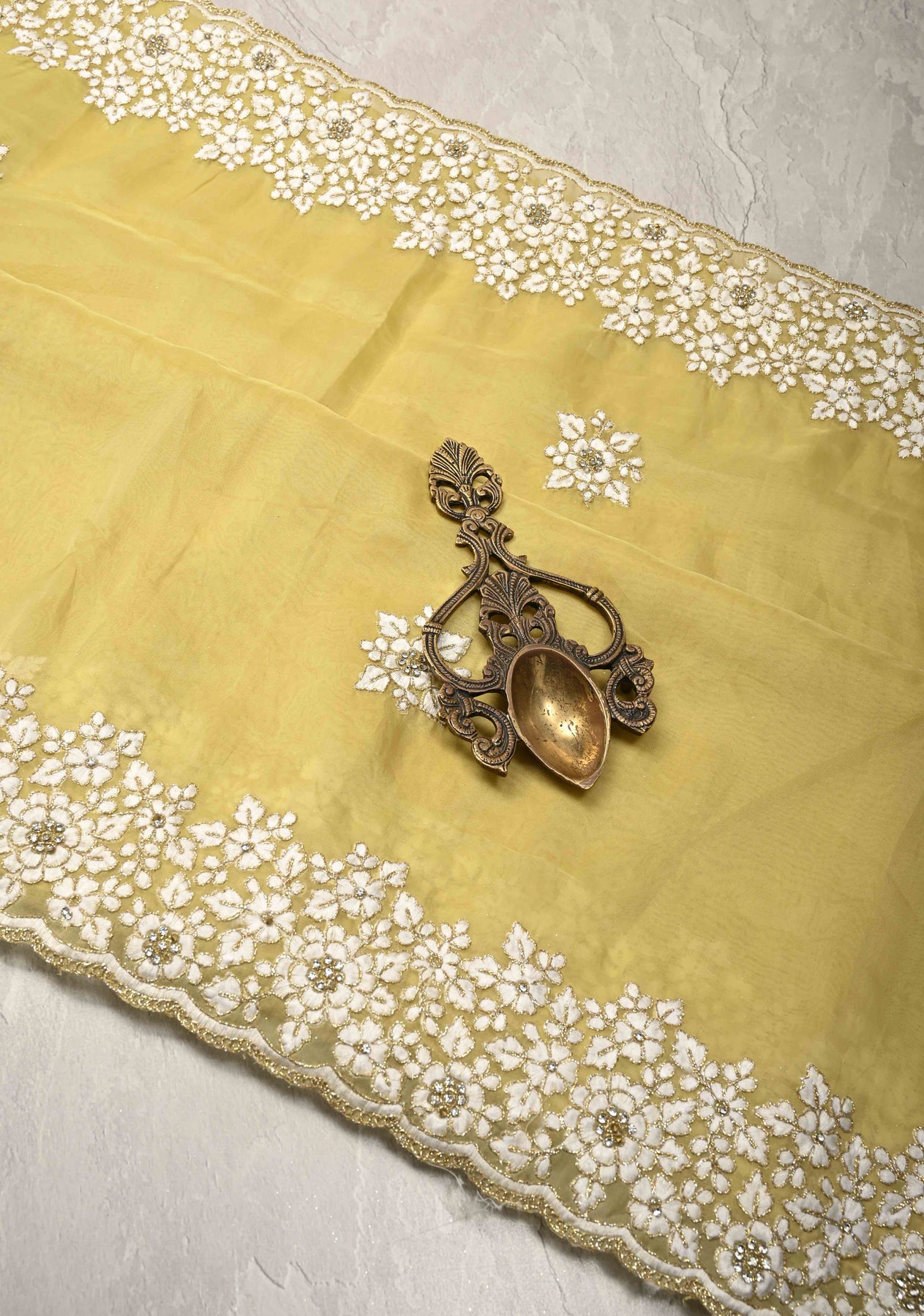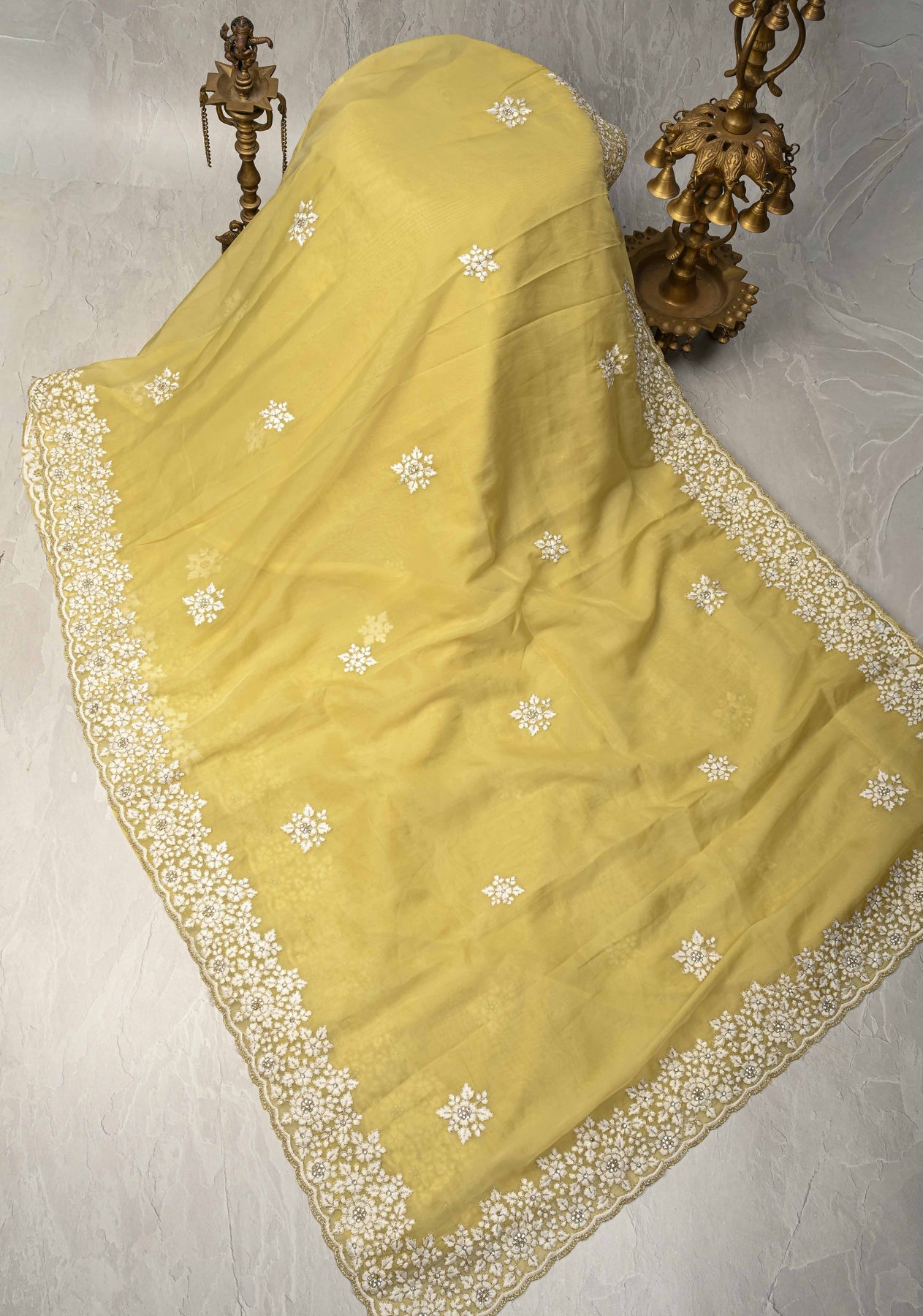 Fresh, vibrant, and effortlessly elegant — this Dusty Yellow Organza Saree is a beautiful fusion of lightness and detail. Made from airy, translucent organza, it features fine machine embroidery that adds intricate texture to its luminous Dusty Yellow hue. Delicate stone work offers a subtle sparkle, making it ideal for both daytime celebrations and evening occasions. The saree is finished with a graceful scallop border, adding a soft, feminine edge to the structured silhouette. Style it with a matching blouse and minimal jewelry for a refreshing and refined festive look.