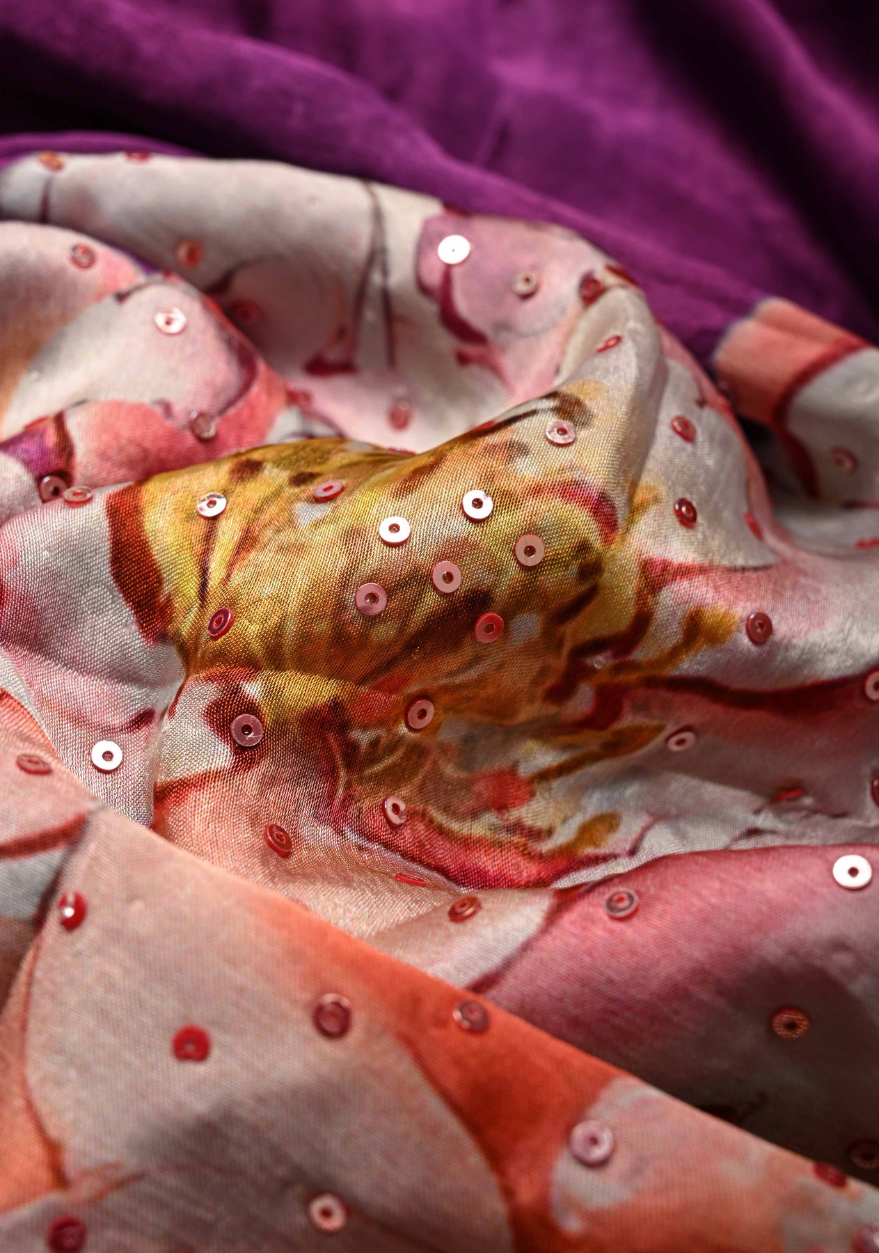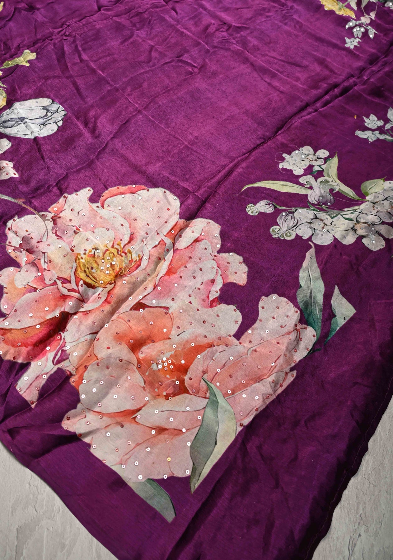 Jamuni Purple Satin Georgette Saree Floral Digital Print and Sequins Detailing