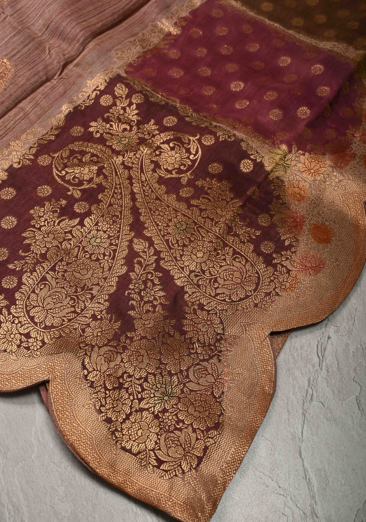 Celebrate color and craftsmanship with this Multicolor Rangkaat Style Brush Dye Vegan Viscose Silk Saree, a stunning piece that blends ethical fashion with timeless elegance. Woven in rangkaat stripes, the saree features beautifully detailed paisley buttas that lend it a traditional yet artistic flair. Made from cruelty-free soft silk, it offers the rich feel and graceful drape of silk while remaining environmentally conscious. The scallop border adds a delicate, contemporary finish, making this saree an ideal choice for festive occasions, weddings, or cultural gatherings where tradition meets modern sophistication.